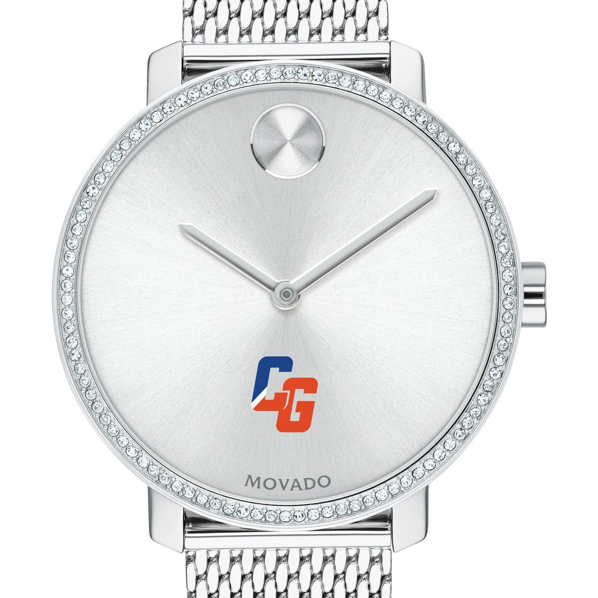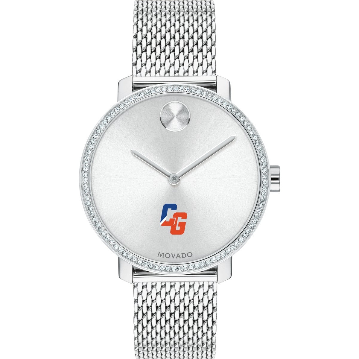 US Coast Guard Academy Women's Movado BOLD watch features the USCGA Logo in full color at 6 o'clock on silver sunray dial.