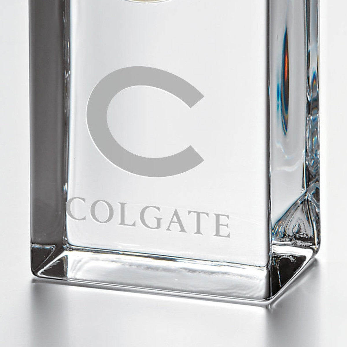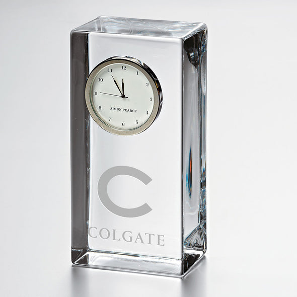 The Colgate Tall Glass Desk Clock stands proudly on any surface, distinctly etched with the Colgate Logo. The clock showcases a traditional numbered face with a sweep hand to count the seconds.