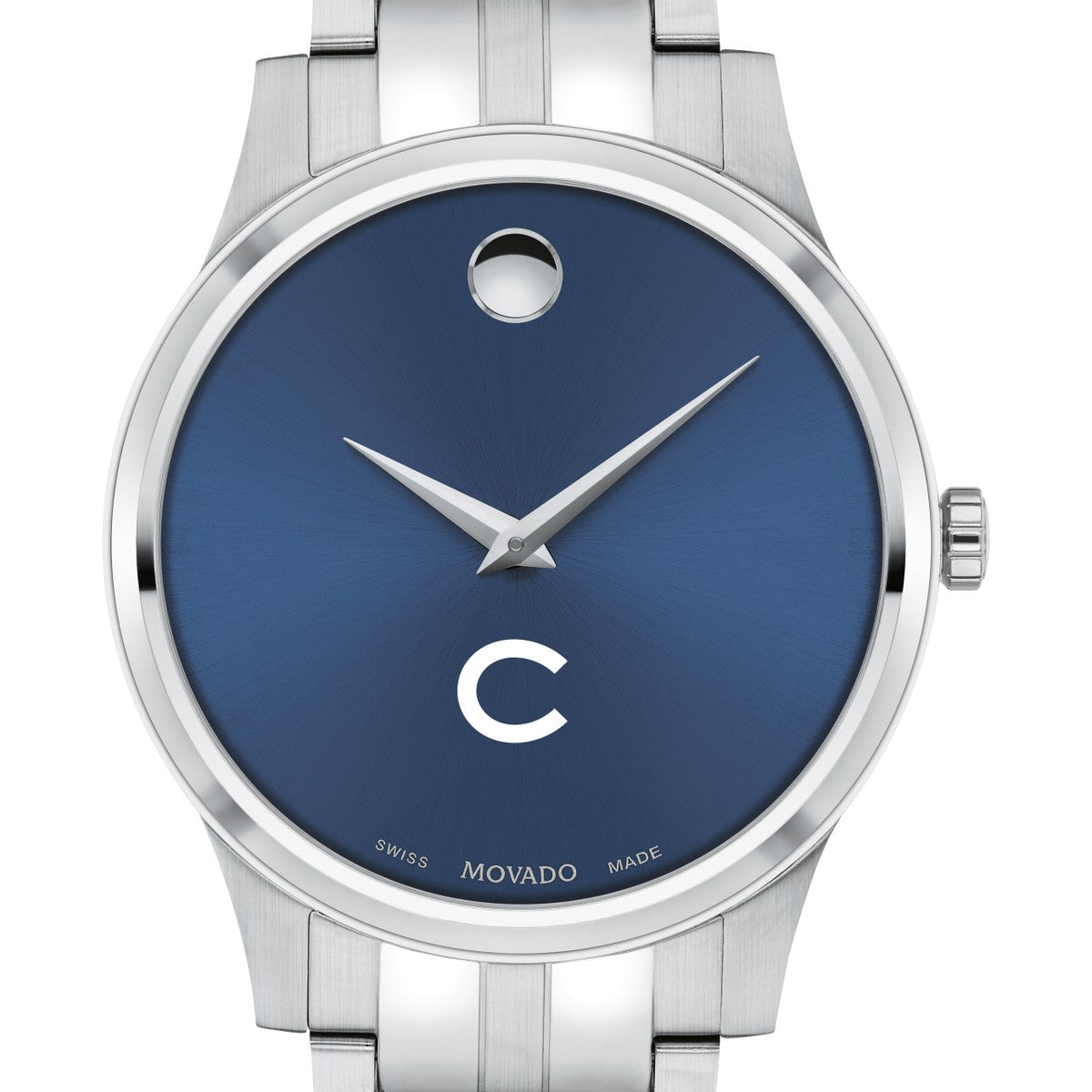 The Colgate University Men's Movado Collection watch boasts a striking blue dial featuring the iconic Colgate Logo in full color. This timeless timepiece, renowned for its concave dot representing the sun at high noon, has been a symbol of elegance since its inception in 1947. Make it uniquely yours with free engraving without affecting order processing time.