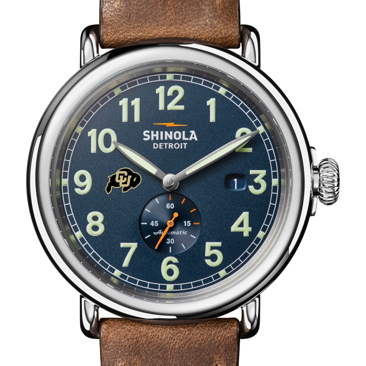 University of Colorado Shinola Watch, The Runwell Automatic 45 mm Blue Dial and British Tan Strap at M.LaHart & Co.