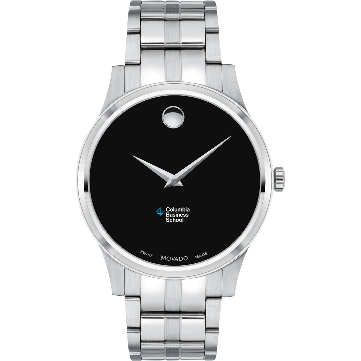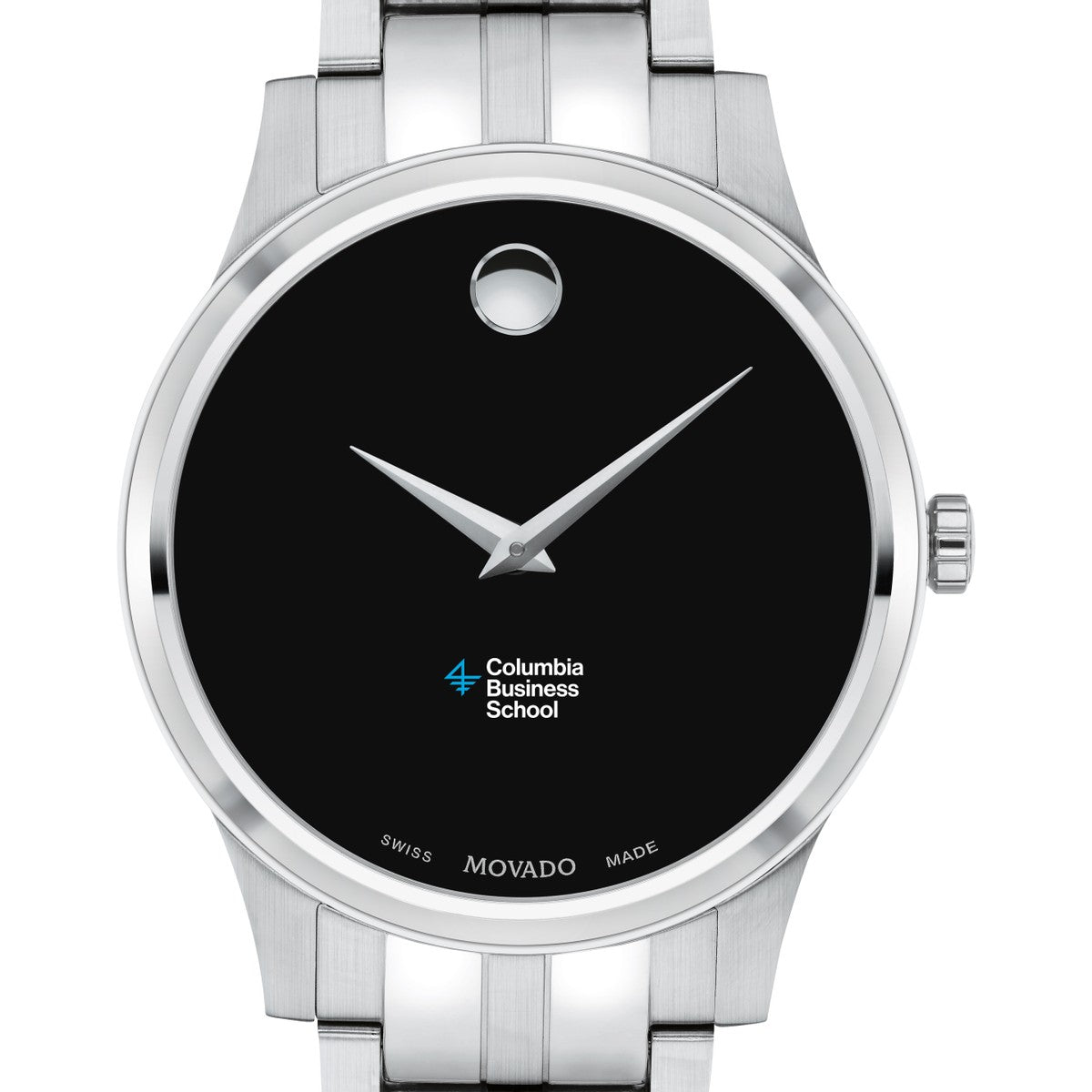 The Columbia Business School Men's Movado Collection watch showcases the iconic Columbia Business logo in full color on a sophisticated black dial. This classic timepiece, featuring the renowned concave dot symbolizing the sun at high noon, has been a design masterpiece since its creation in 1947. Personalize your watch with free engraving without any delay to your order.