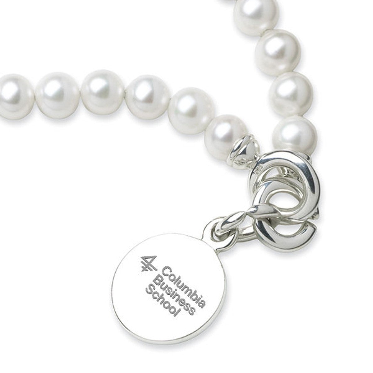Columbia Business School pearl bracelet and sterling silver Columbia Business charm features the Columbia Business logo delicately engraved on front and interlocking "C" clasp.