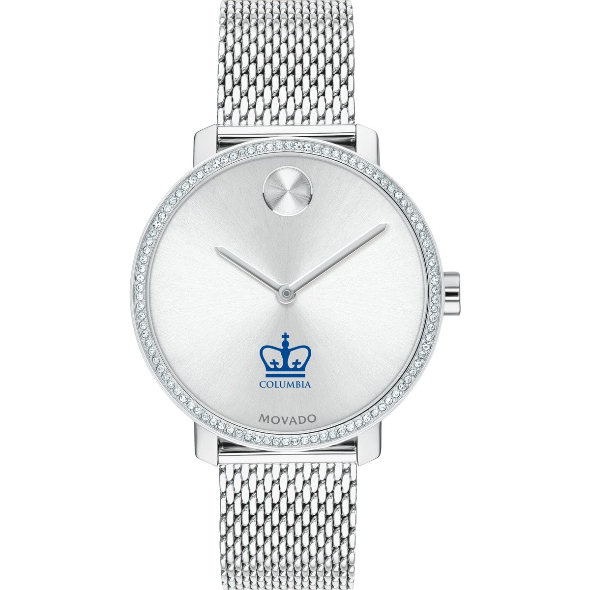 Columbia University Women's Movado BOLD watch features the Columbia Logo in full color at 6 o'clock on silver sunray dial.