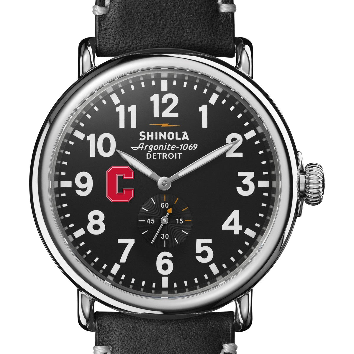 The Shinola Runwell features the Cornell Logo in color on the black dial with a large 47 mm case. Every detail of Shinola's flagship timepiece has been engineered with an obsessive focus to ensure it can be worn any way but it can't be worn out. Complimentary personal engraving