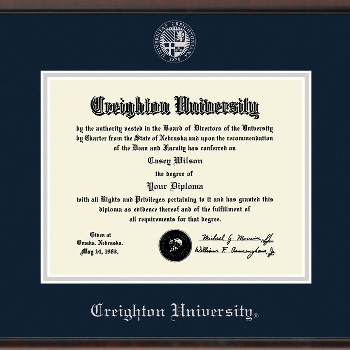 This Creighton University diploma frame is crafted from solid wood in the USA. Proudly display your Creighton diploma with museum quality conservation mounting materials to showcase and protect your Creighton University diploma.
