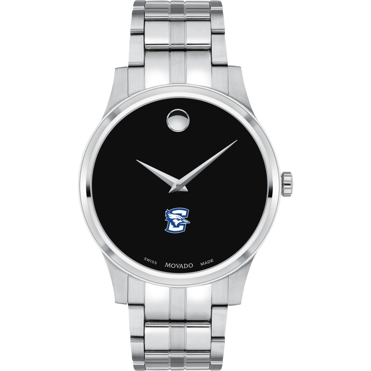 The Creighton University Men's Movado Collection watch showcases the iconic Creighton Logo in full color on a sophisticated black dial. This classic timepiece, featuring the renowned concave dot symbolizing the sun at high noon, has been a design masterpiece since its creation in 1947. Personalize your watch with free engraving without any delay to your order.