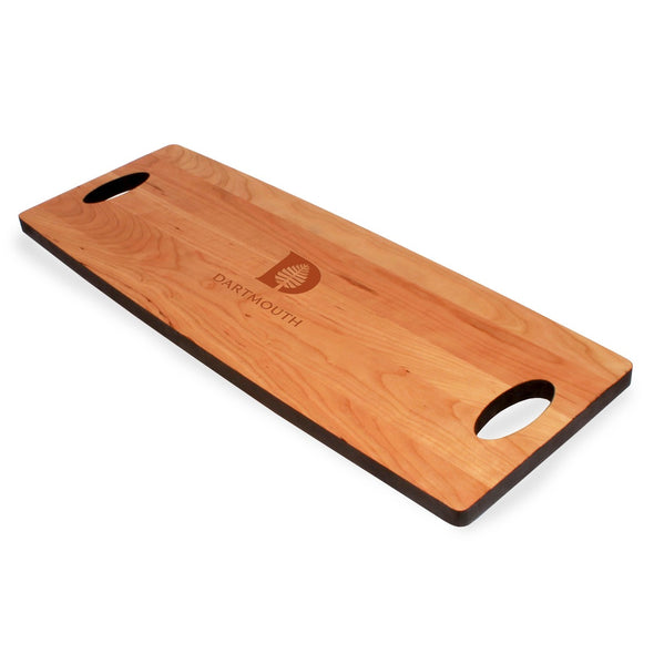 The Dartmouth College Cherry Entertaining Board features the Dartmouth Logo beautifully engraved in the center. The sleek, elongated shape with black burnished edges makes a wonderful focal point on the table, and the oval handles permit easy transport from the kitchen.
