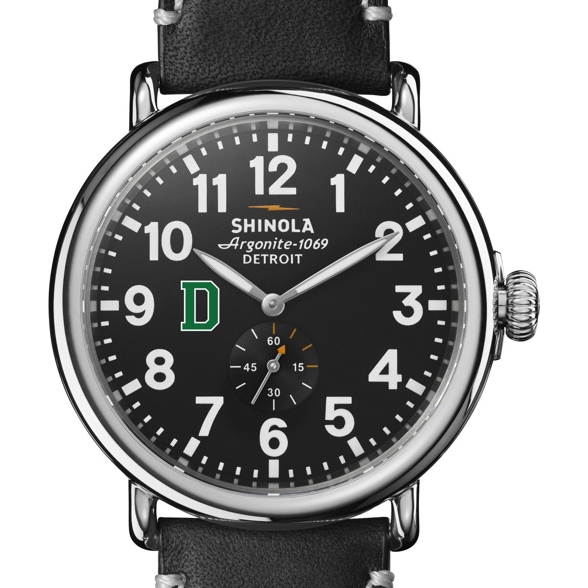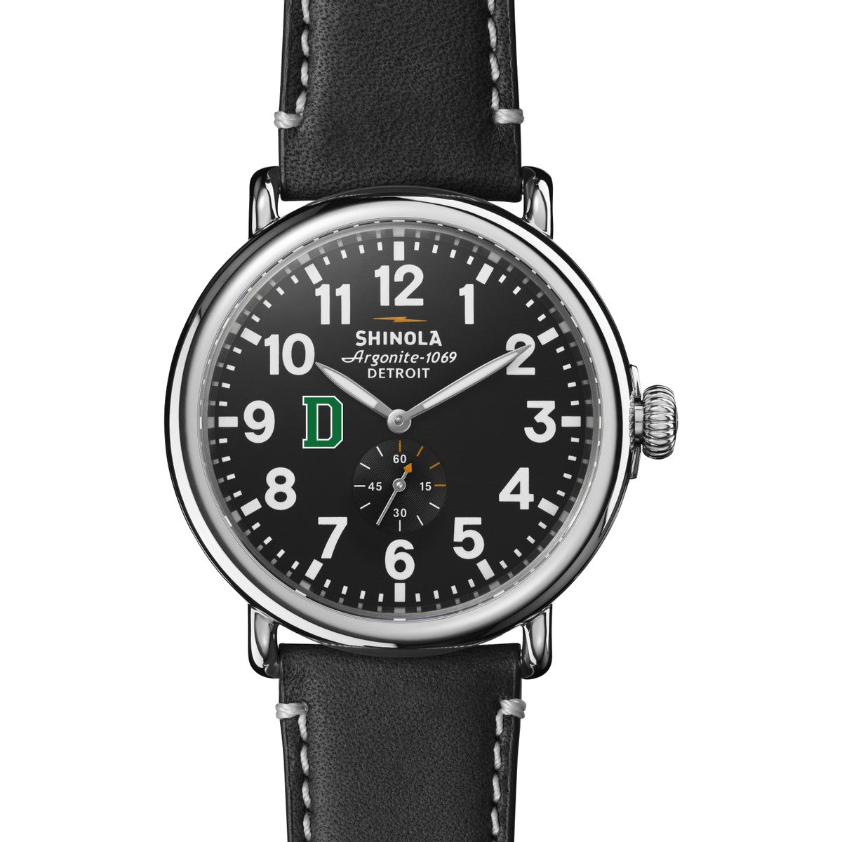 The Shinola Runwell features the Dartmouth Logo in color on the black dial with a large 47 mm case. Every detail of Shinola's flagship timepiece has been engineered with an obsessive focus to ensure it can be worn any way but it can't be worn out. Complimentary personal engraving
