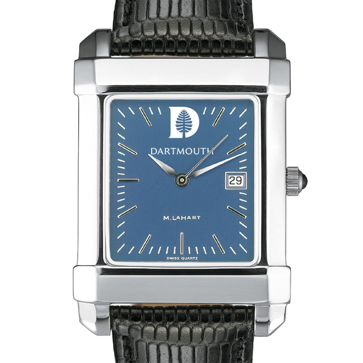 Dartmouth College men's steel watch featuring Dartmouth shield at 12 o'clock and "Dartmouth College" inscribed below on blue dial.