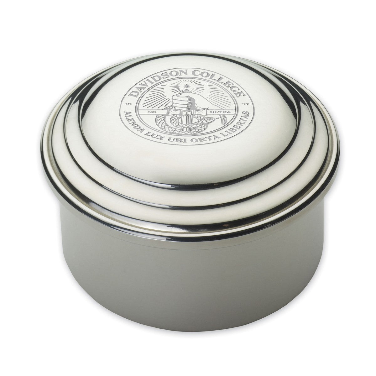 Davidson College pewter keepsake box is a beautiful space to store your treasures and features the Davidson logo on its lid.