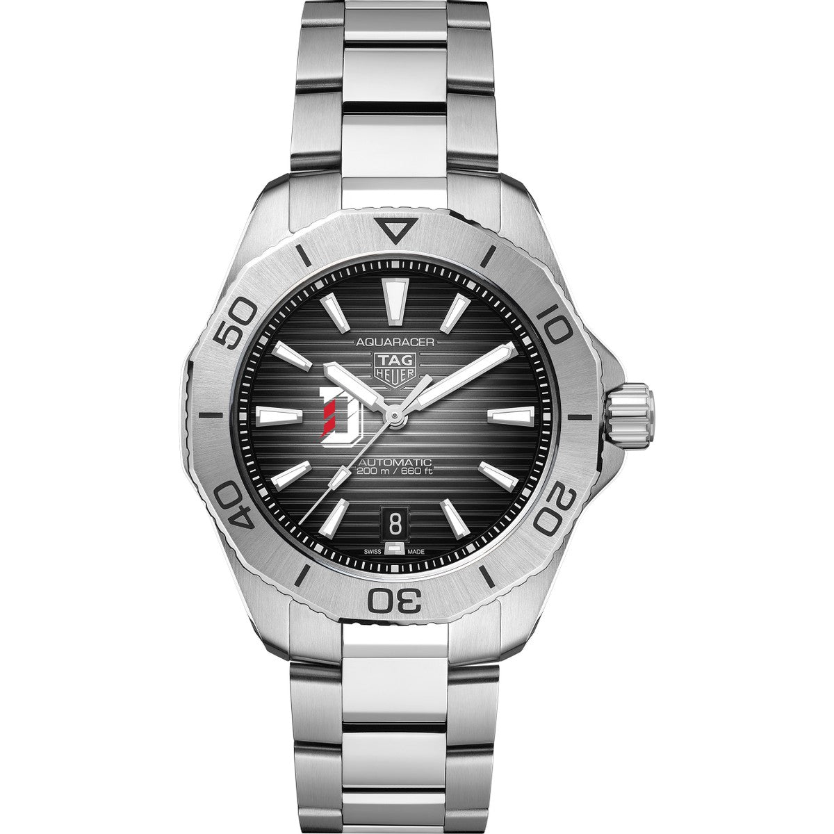 Built for performance and styled for distinction, the Davidson College Men's TAG Heuer Steel Automatic Aquaracer features Davidson logo on a bold black dial and rugged stainless steel construction. Engineered for reliability and precision, it’s a dynamic expression of school pride and professional-grade craftsmanship. Complimentary personal engraving.