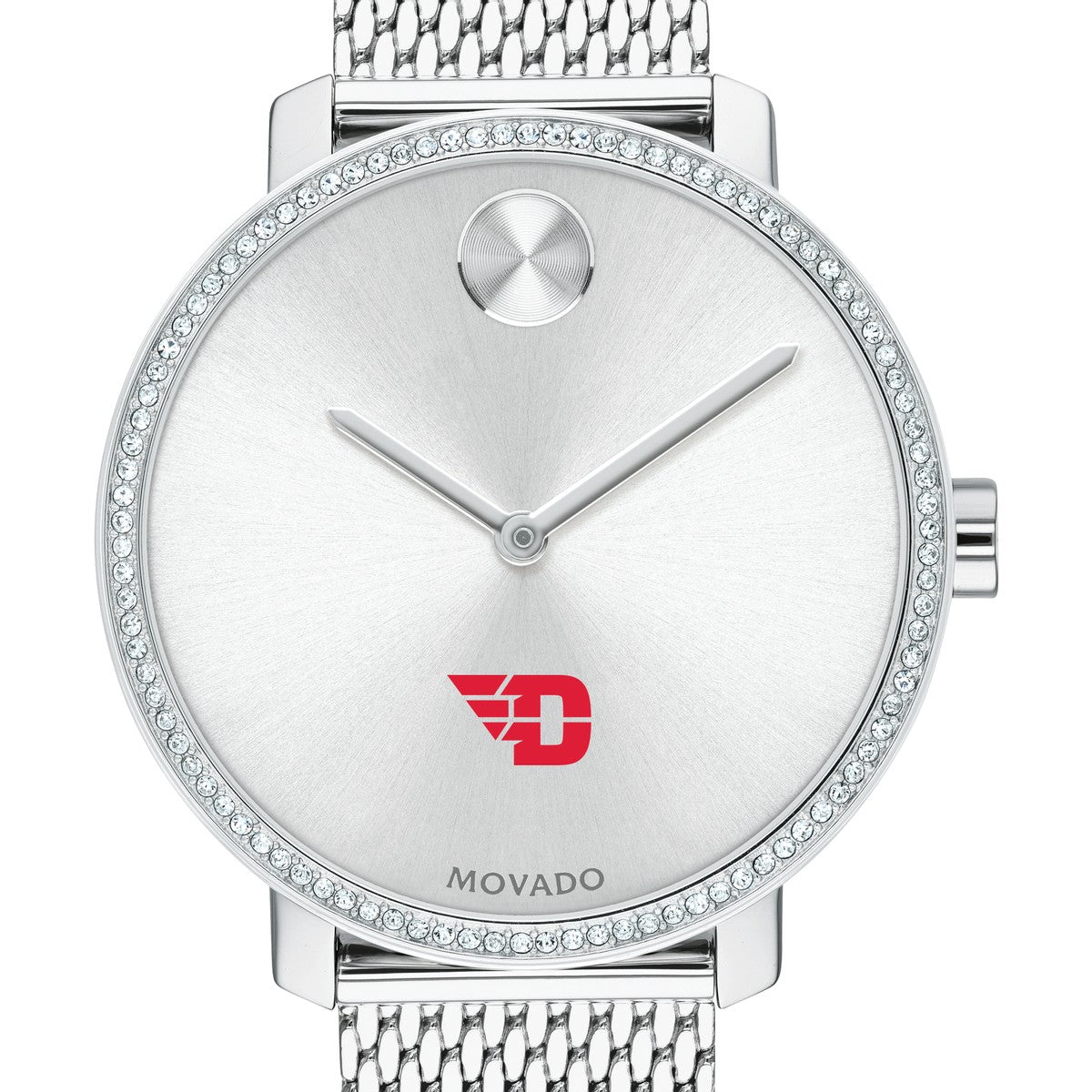 University of Dayton Women's Movado BOLD watch features the Dayton Logo in full color at 6 o'clock on silver sunray dial.