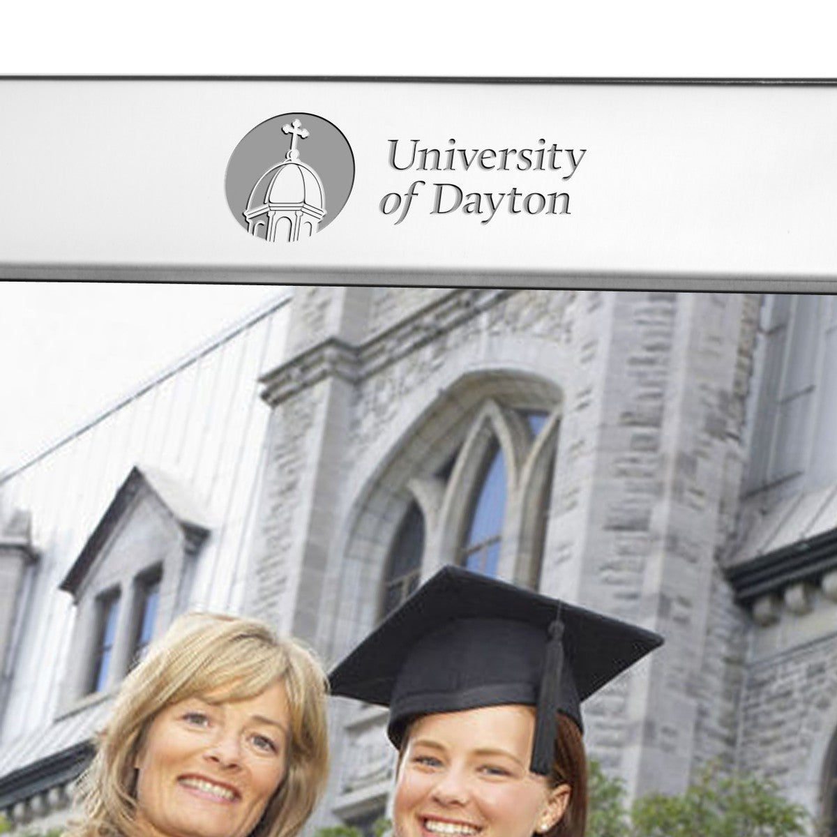 Handsomely engraved University of Dayton pewter frame, generously accommodates your custom-engraved personal message.