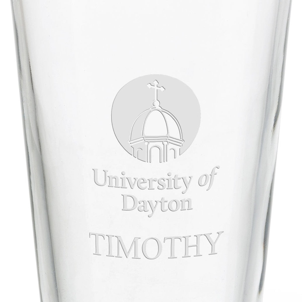 Each Dayton 16 oz pint glass is deep-etched with the University of Dayton logo. Its simple styling and crystal-clear clarity make this glass perfect for any drink. Your name can be added under the logo for free.
