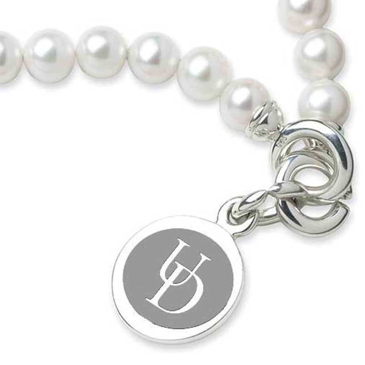 University of Delaware pearl bracelet and sterling silver Delaware charm features the Delaware Logo delicately engraved on front and interlocking "C" clasp.