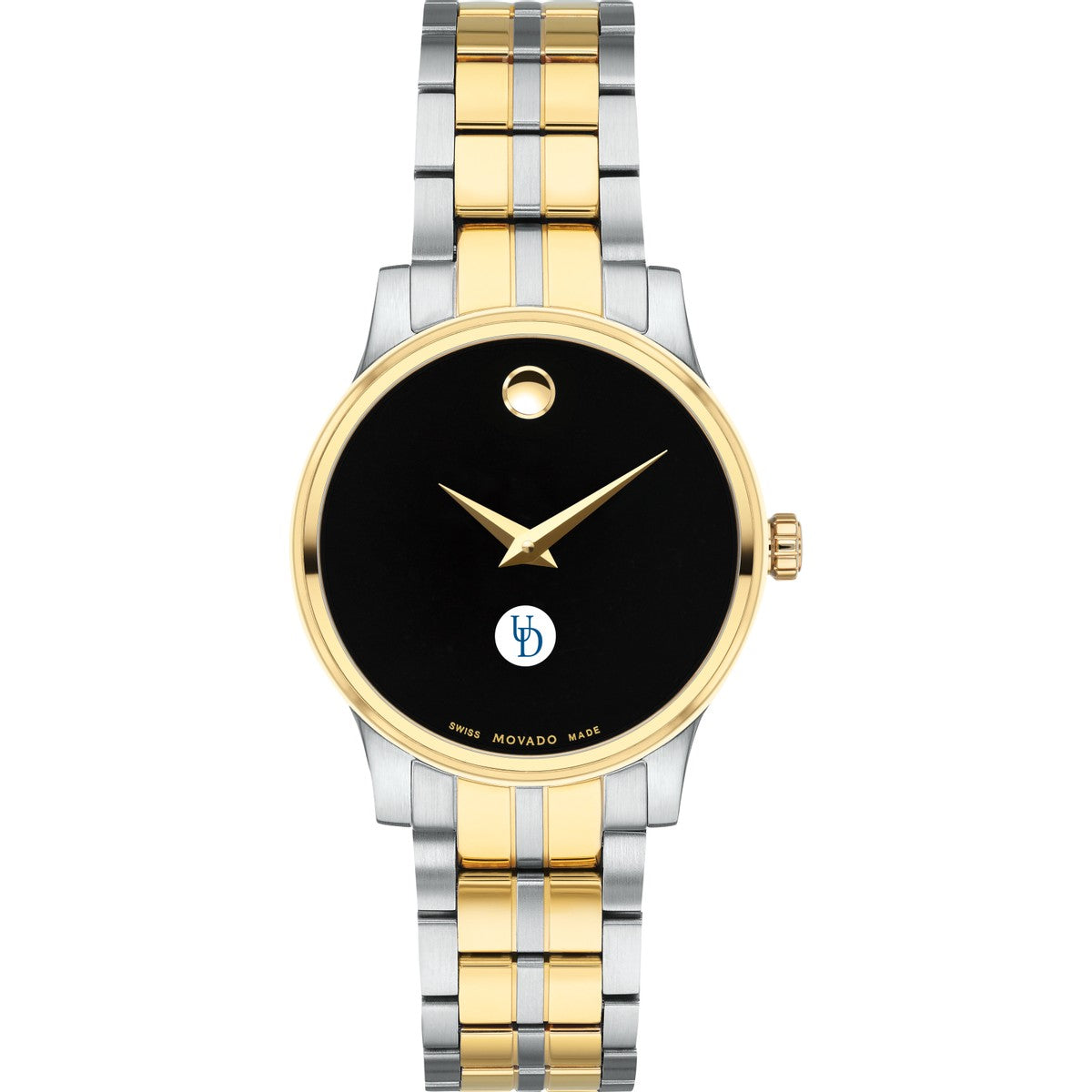 The University of Delaware Women's Movado Collection watch showcases the iconic Delaware Logo in full color against a sophisticated black dial. This elegant timepiece, featuring the renowned concave dot symbolizing the sun at high noon, embodies timeless style. Personalize your watch with free engraving without any delay to your order.