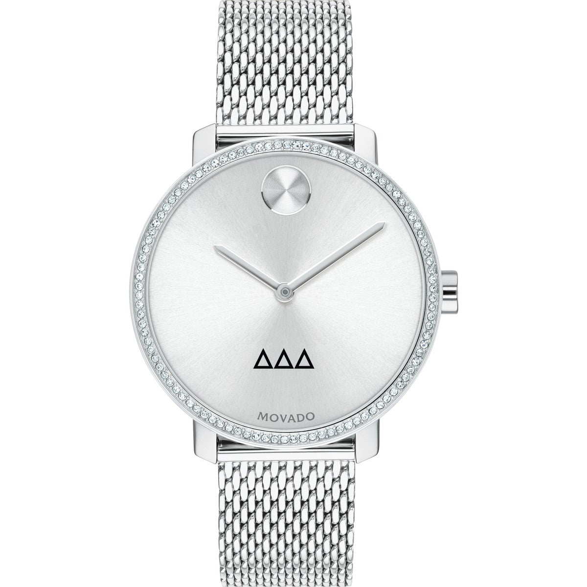 Delta Delta Delta Women's Movado BOLD watch features the Delta Delta Delta Logo in full color at 6 o'clock on silver sunray dial.