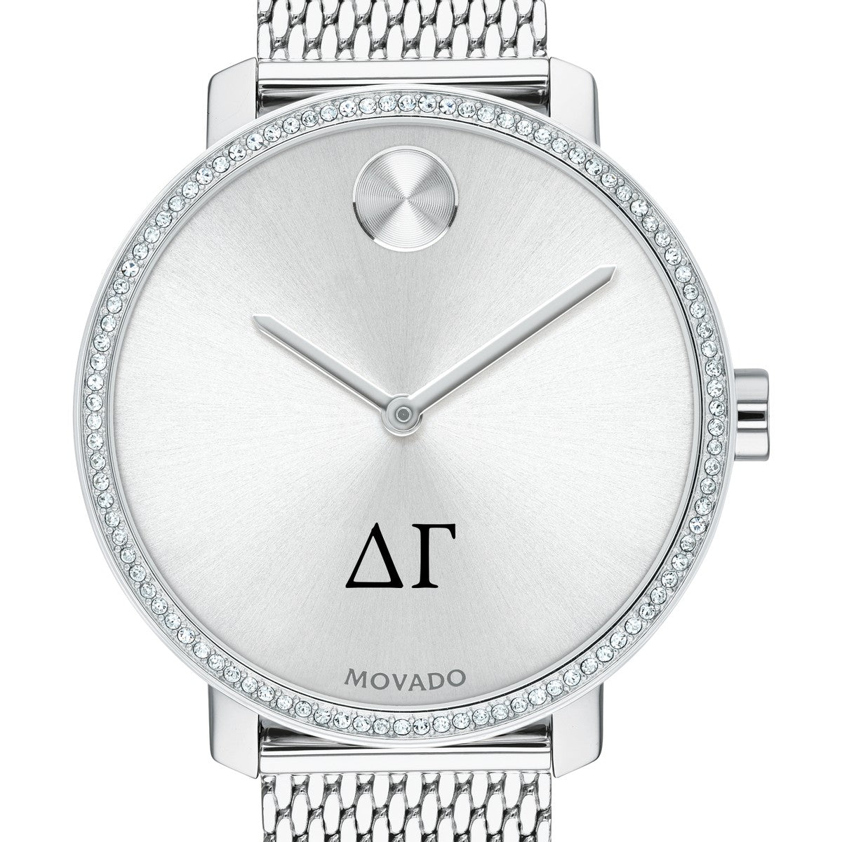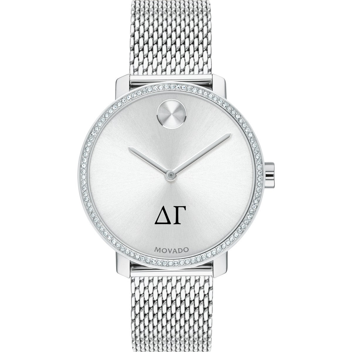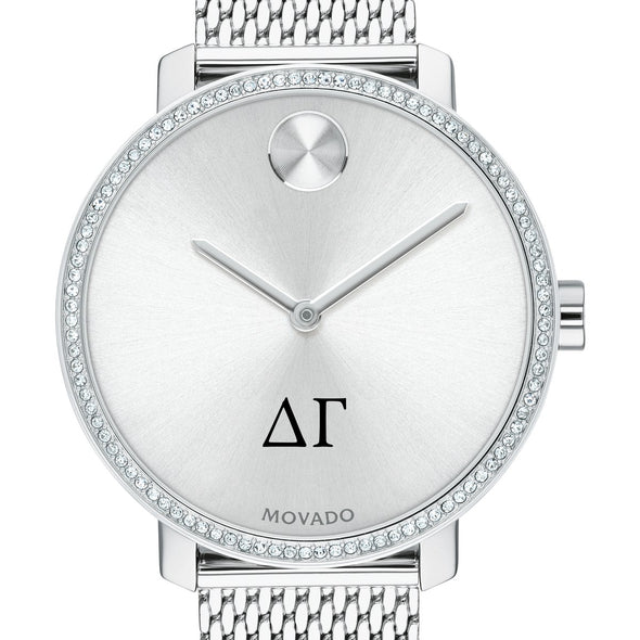 Delta Gamma Women's Movado BOLD watch features the Delta Gamma Logo in full color at 6 o'clock on silver sunray dial.
