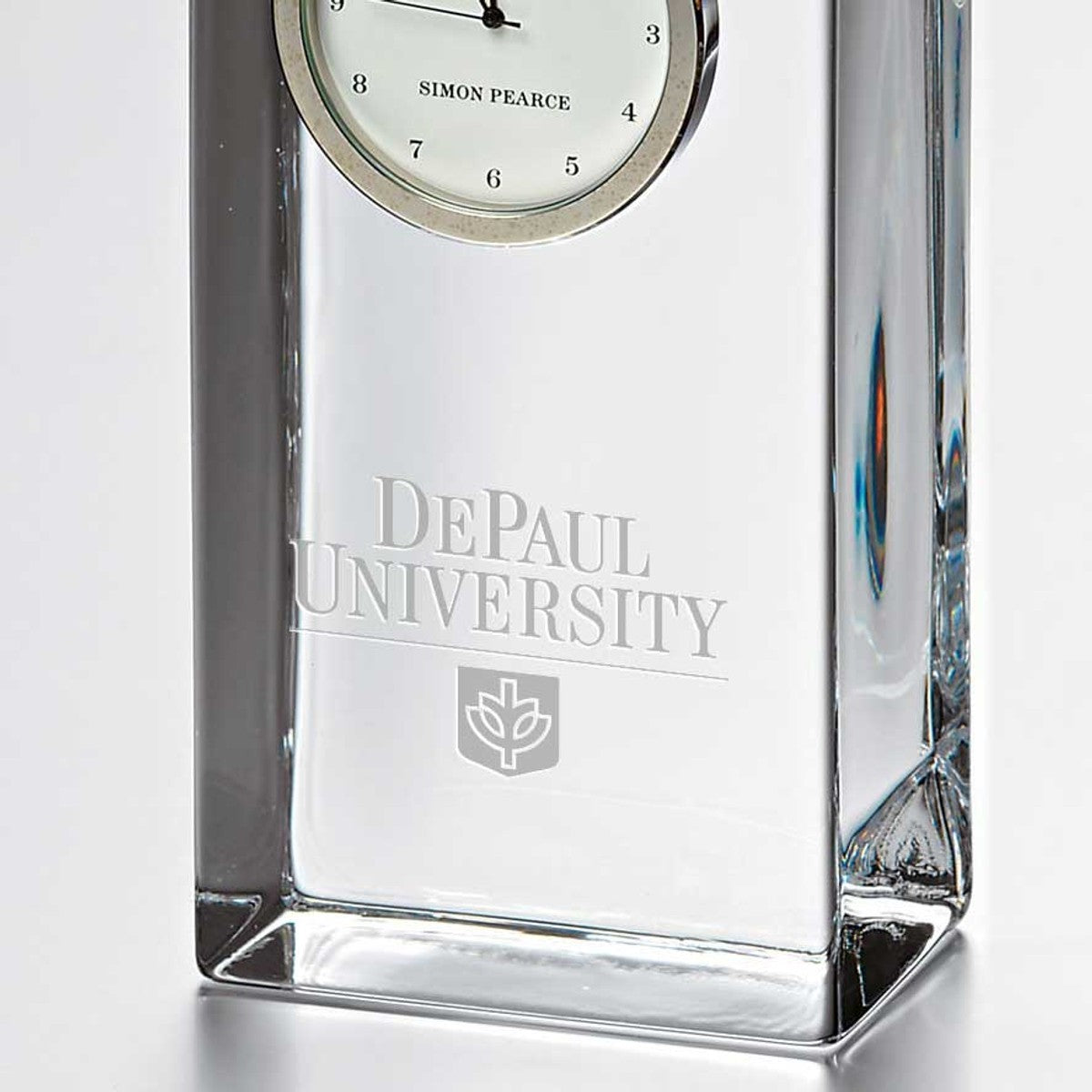 The DePaul Tall Glass Desk Clock stands proudly on any surface, distinctly etched with the DePaul Logo. The clock showcases a traditional numbered face with a sweep hand to count the seconds.
