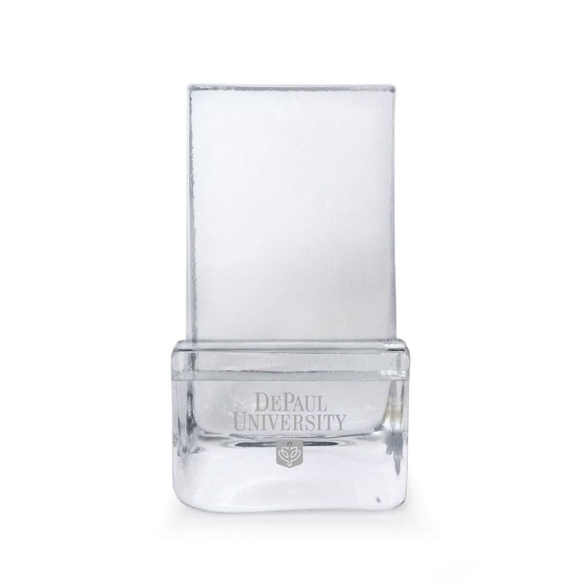 This handcrafted DePaul University Glass Phone Holder is the perfect addition to your work or home environment. Formed from only the finest clear glass, the DePaul Logo is distinctly etched on the front.