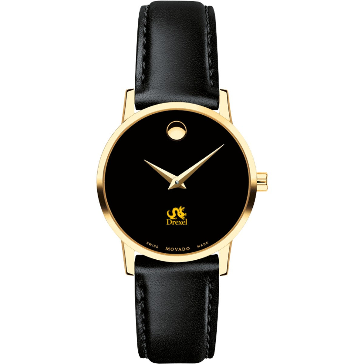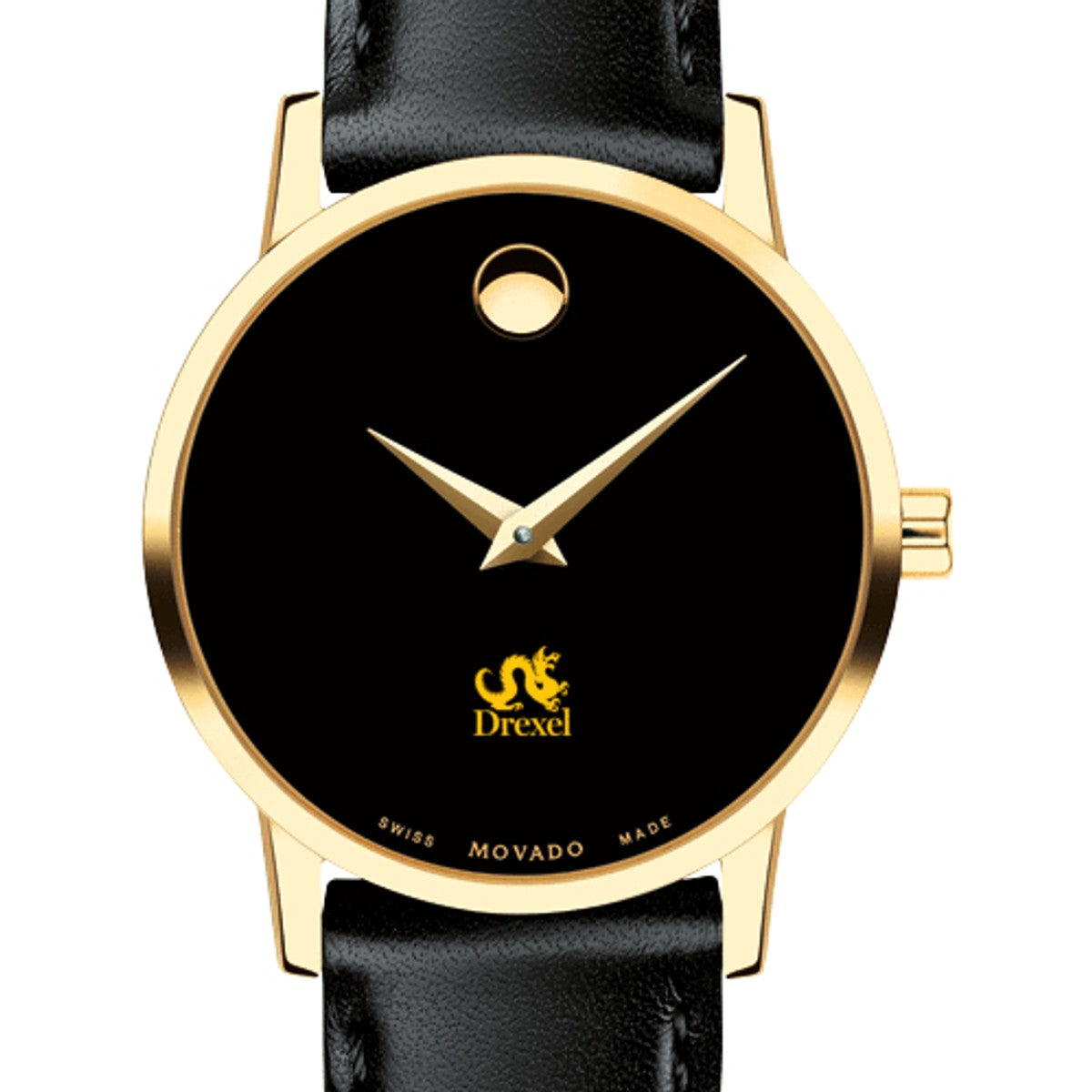 Drexel University Women's Movado Museum watch features the Drexel Logo in full color at 6 o'clock on black dial. Created in 1947, the iconic concave dot symbolizes the sun at high-noon. Complimentary personal engraving.