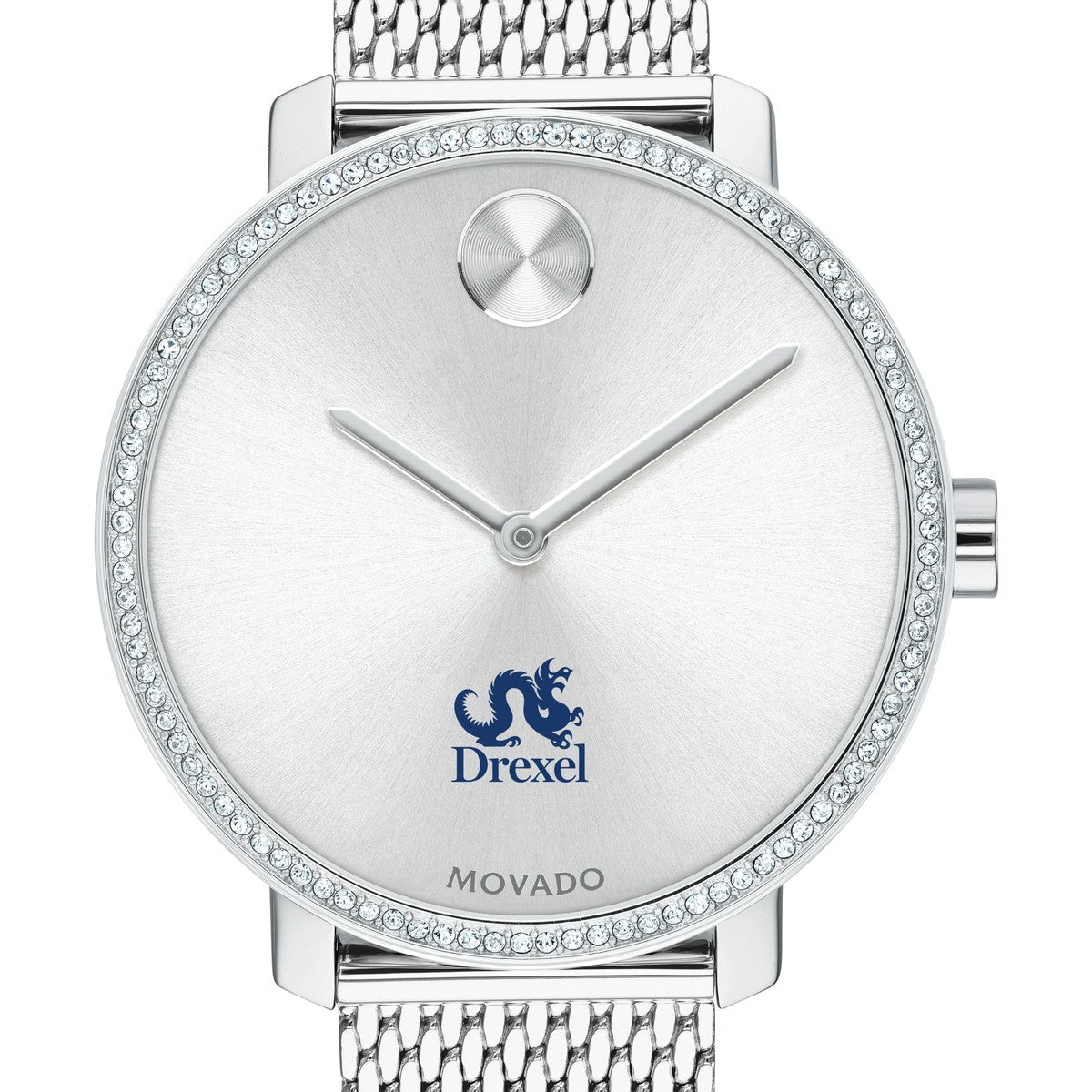 Drexel University Women's Movado BOLD watch features the Drexel Logo in full color at 6 o'clock on silver sunray dial.