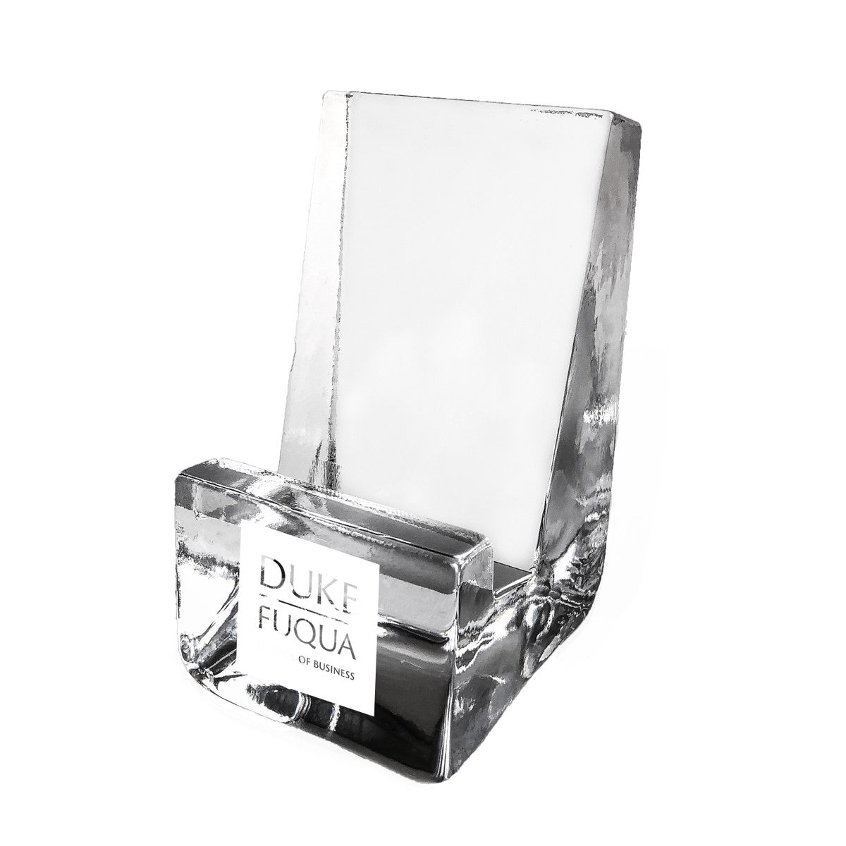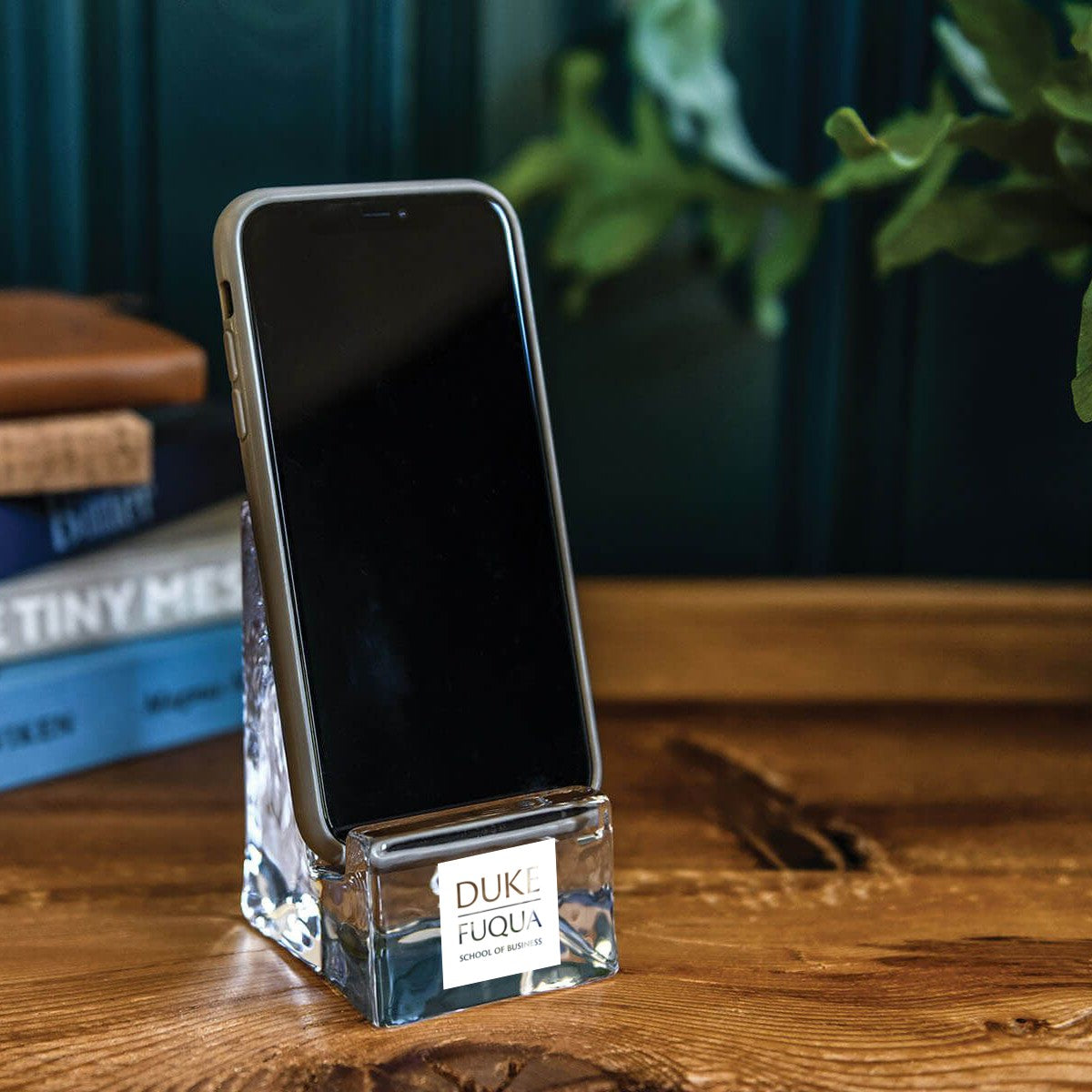 This handcrafted Duke Fuqua School of Business Glass Phone Holder is the perfect addition to your work or home environment. Formed from only the finest clear glass, the Duke Fuqua logo is distinctly etched on the front.