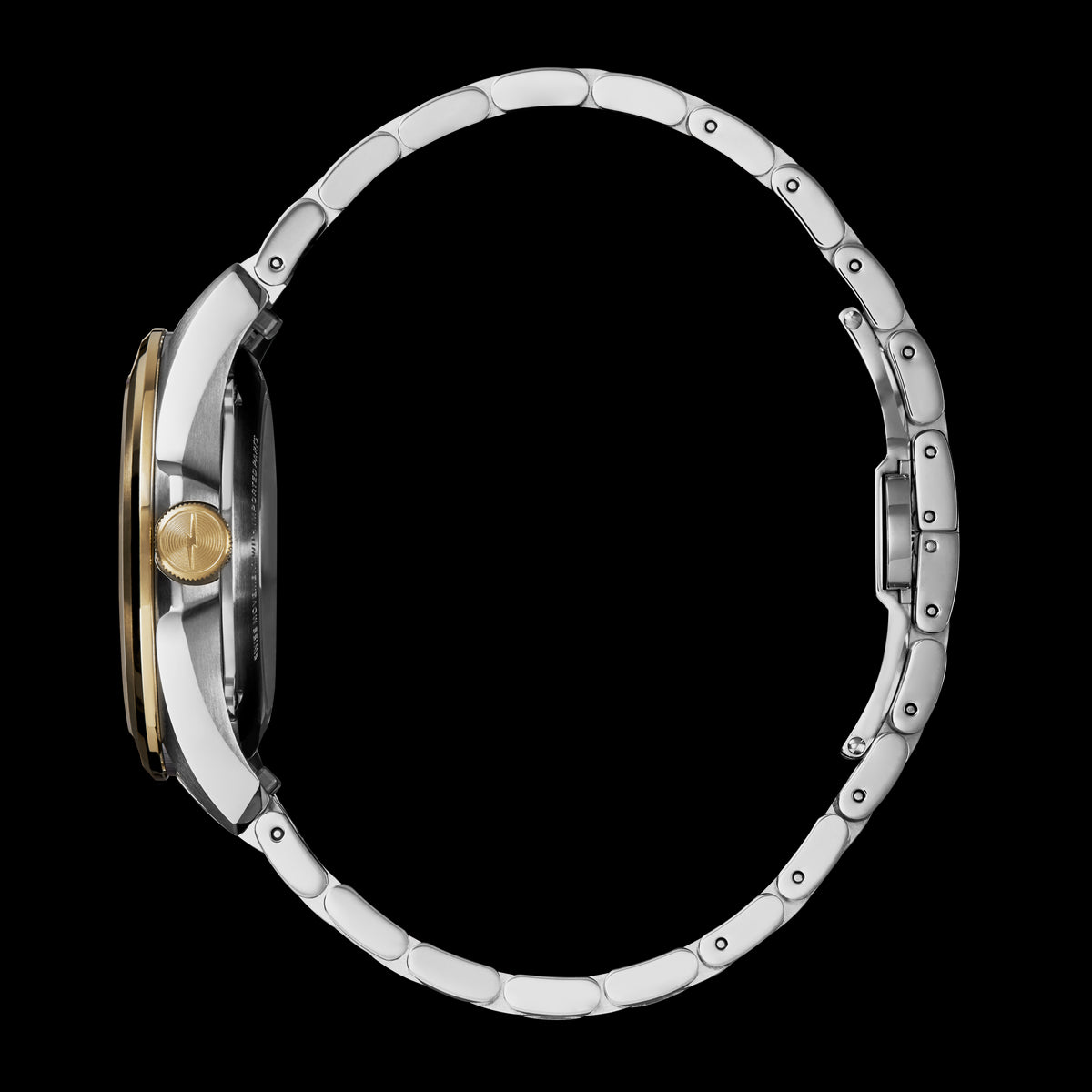 - Mother-of-pearl dial features gold PVD Arabic numeral indices, a calendar aperture, and Super-LumiNova on the markers and hands