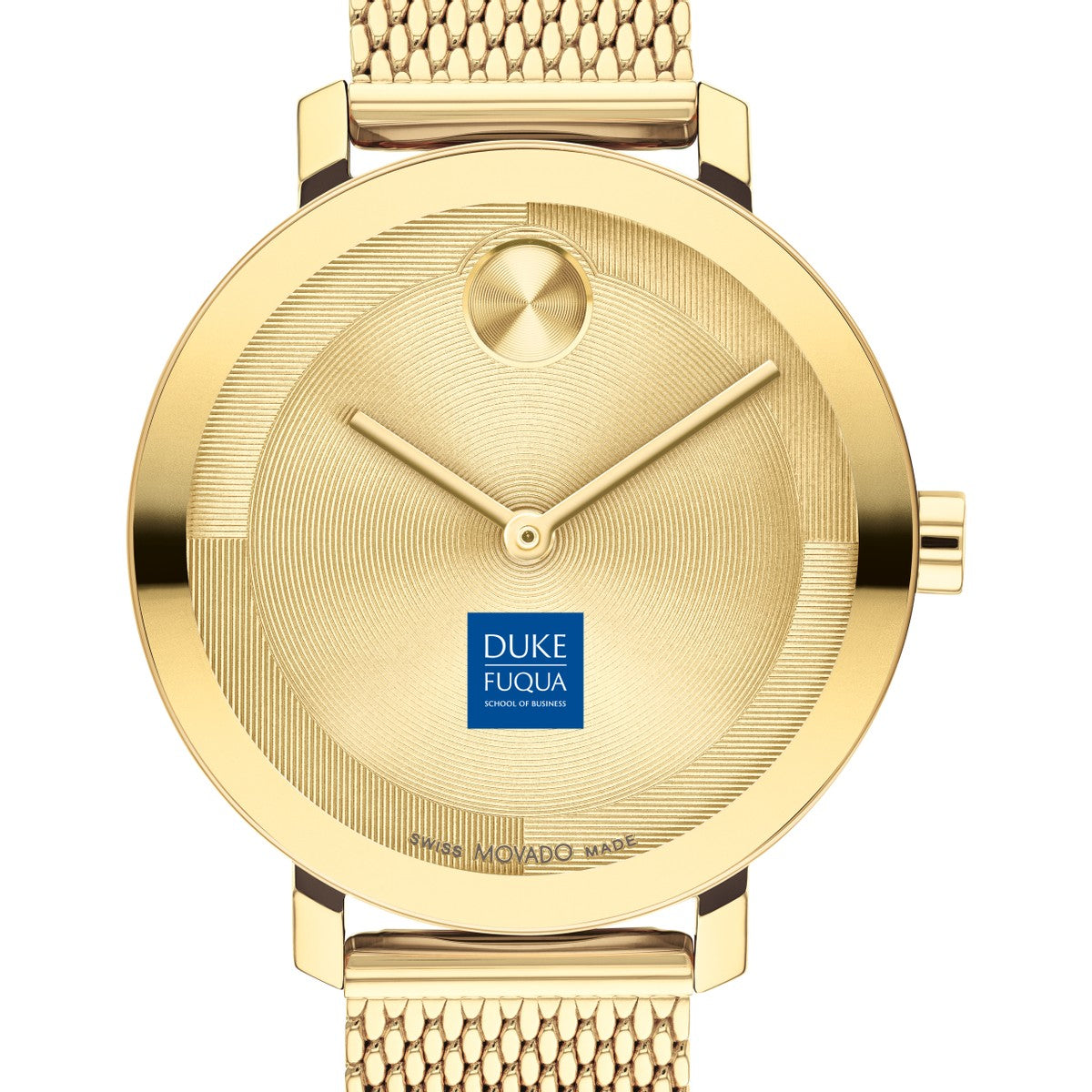 The Duke Fuqua School of Business Women's BOLD Movado features the prestigious Duke Fuqua logo. Its pale gold Ionic-plated stainless steel mesh bracelet exudes contemporary elegance, making it a timeless accessory for the modern woman.