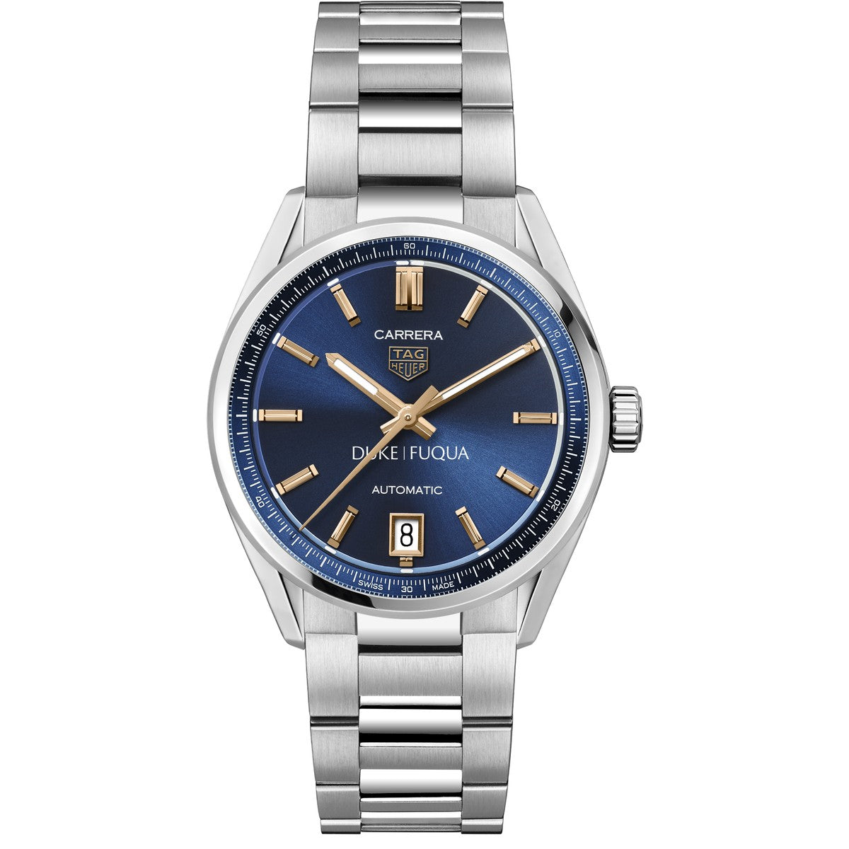 Discover the Duke Fuqua Women's TAG Heuer Steel Carrera watch, showcasing the Duke Fuqua logo on a deep-blue sunray brushed dial with 18K 5N rose gold-plated hands and indexes. Powered by the Calibre 7 movement, this timepiece is designed for precision and excellence. Complimentary personal engraving.