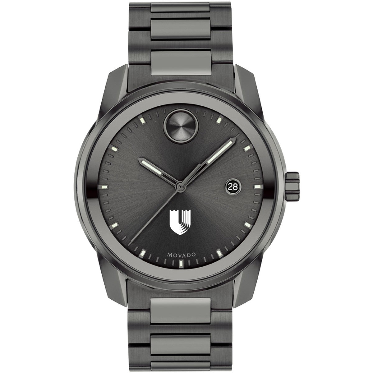 Duke University School of Medicine Men's Movado BOLD Gunmetal Grey with Date Window features high-tech materials, bold signature dot, and the sophistication of Movado with the Duke Med logo. Complimentary personal engraving.
