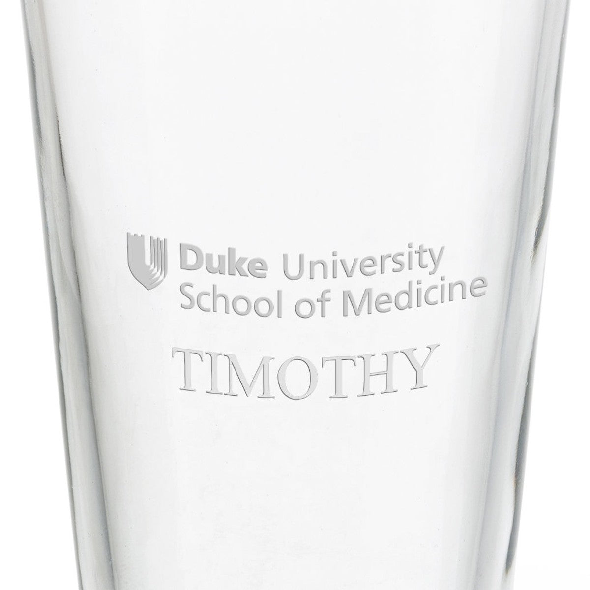 Each Duke Med 16 oz pint glass is deep-etched with the Duke University School of Medicine logo. Its simple styling and crystal-clear clarity make this glass perfect for any drink. Your name can be added under the logo for free.