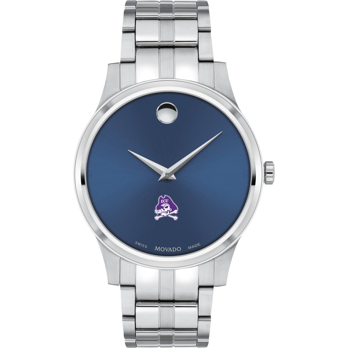 The East Carolina University Men's Movado Collection watch boasts a striking blue dial featuring the iconic ECU Logo in full color. This timeless timepiece, renowned for its concave dot representing the sun at high noon, has been a symbol of elegance since its inception in 1947. Make it uniquely yours with free engraving without affecting order processing time.
