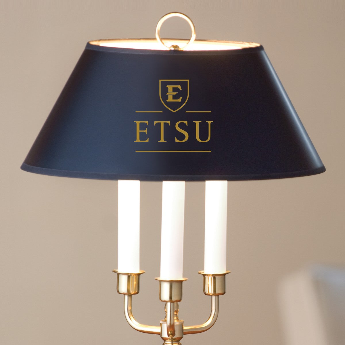 - East Tennessee State logo in gold on the black parchment shade