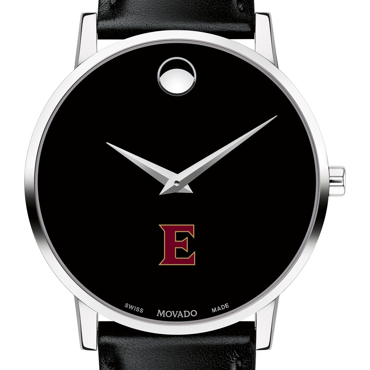 Elon University Men's Movado Museum watch features the Elon logo in full color at 6 o'clock on black dial. Created in 1947, the iconic concave dot symbolizes the sun at high-noon. Complimentary personal engraving.
