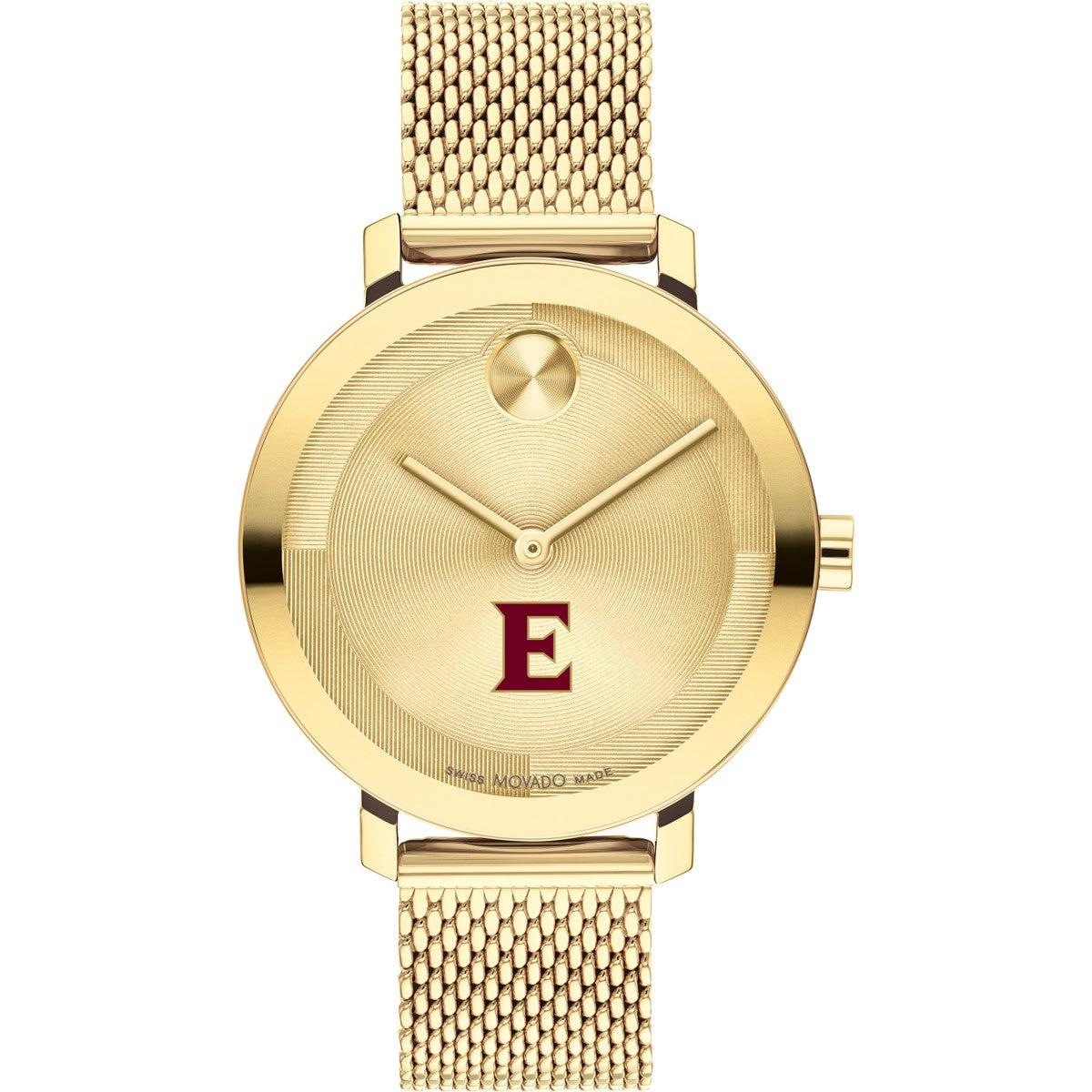 The Elon University Women's BOLD Movado features the prestigious Elon logo. Its pale gold Ionic-plated stainless steel mesh bracelet exudes contemporary elegance, making it a timeless accessory for the modern woman.