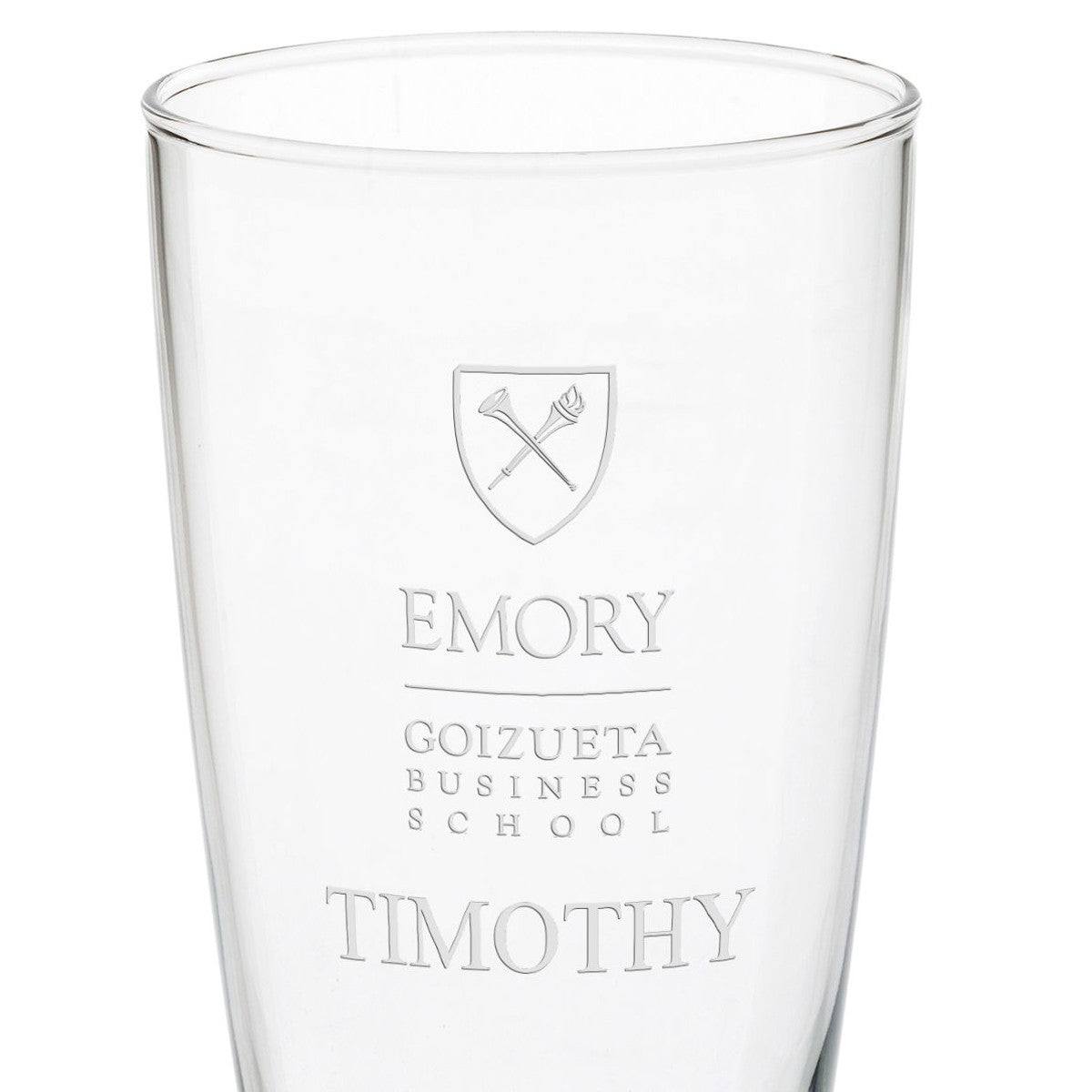 Fans can raise a glass to Emory Goizueta with these glasses. The Emory Goizueta logo is deep-etched, and your name can be added under the logo for free.