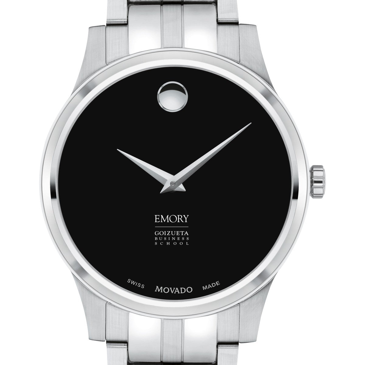 The Emory Goizueta Business School Men's Movado Collection watch showcases the iconic Emory Goizueta logo in full color on a sophisticated black dial. This classic timepiece, featuring the renowned concave dot symbolizing the sun at high noon, has been a design masterpiece since its creation in 1947. Personalize your watch with free engraving without any delay to your order.