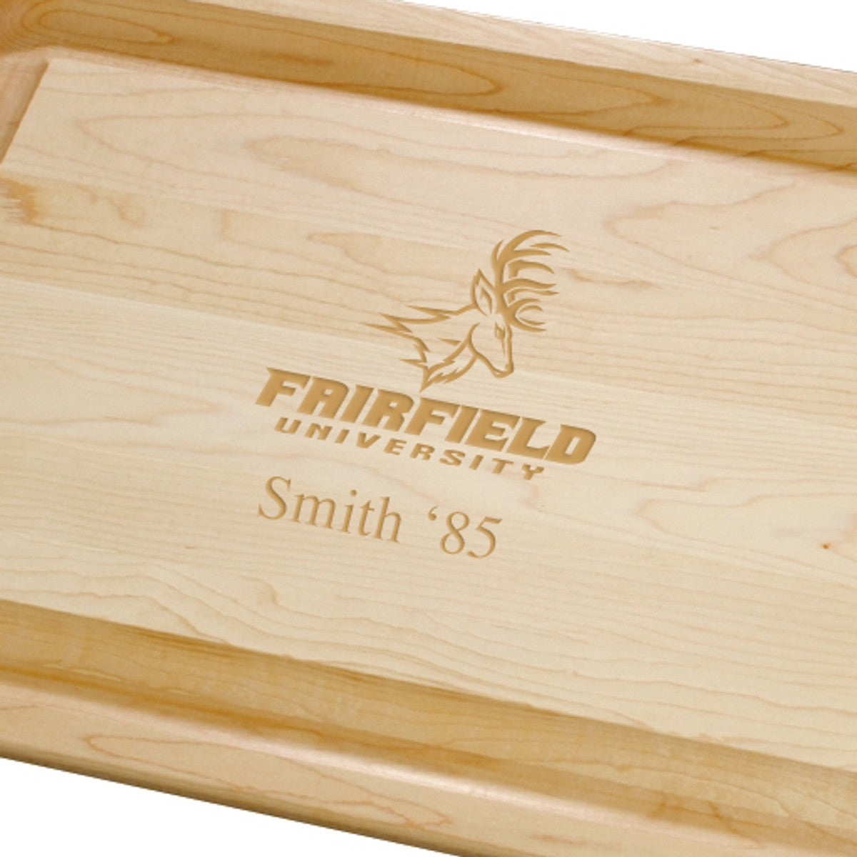 The Fairfield University Maple Cutting Board is crafted from sturdy Maple with undercut handles and a wide groove to collect juices while you carve. Ample surface featuring the Fairfield Logo is suitable for both cutting and serving.