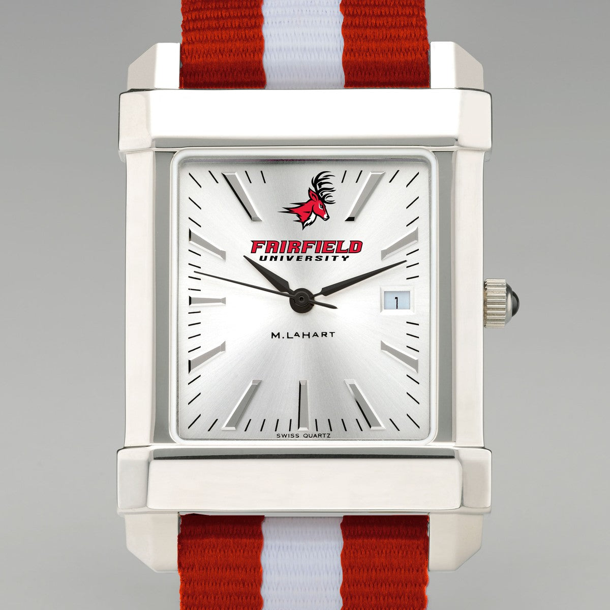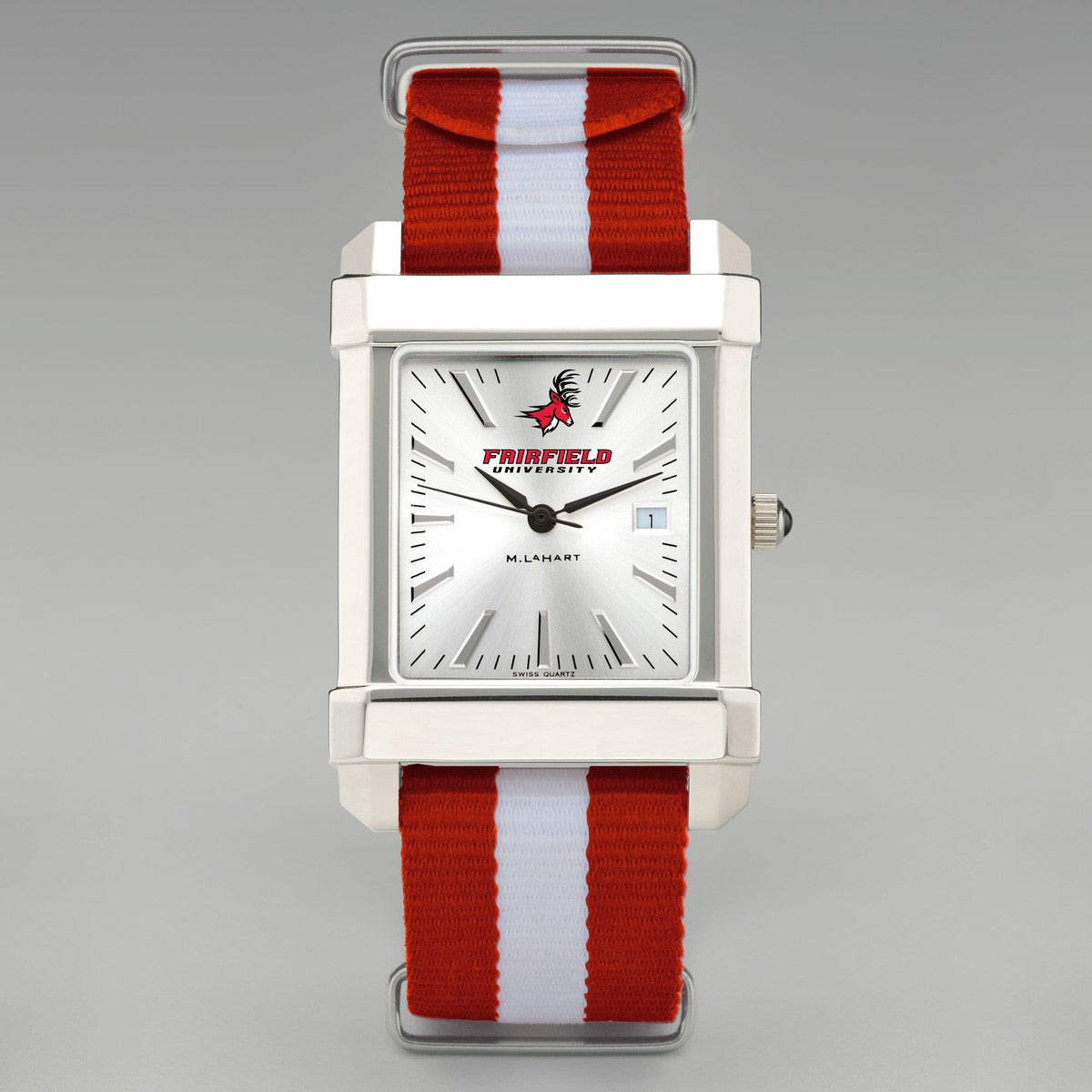 This Fairfield University original features the Fairfield Logo on our sophisticated new dial with a sunray brushed metallic finish. The RAF Nylon strap popularized by James Bond now features your school colors for the first time. Free personalization available on the back of the watch with initials and graduation year.