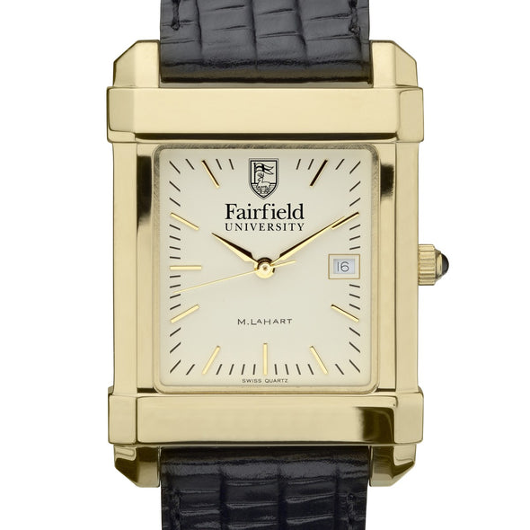 Fairfield University men's gold watch featuring the Fairfield Logo on cream dial. Free Engraving on all watches.