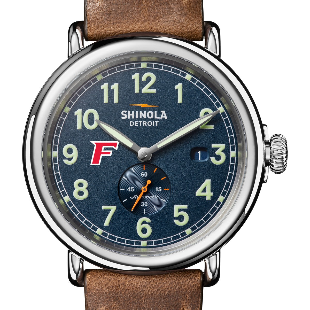Fairfield University Shinola Watch, The Runwell Automatic 45 mm Blue Dial and British Tan Strap at M.LaHart & Co.