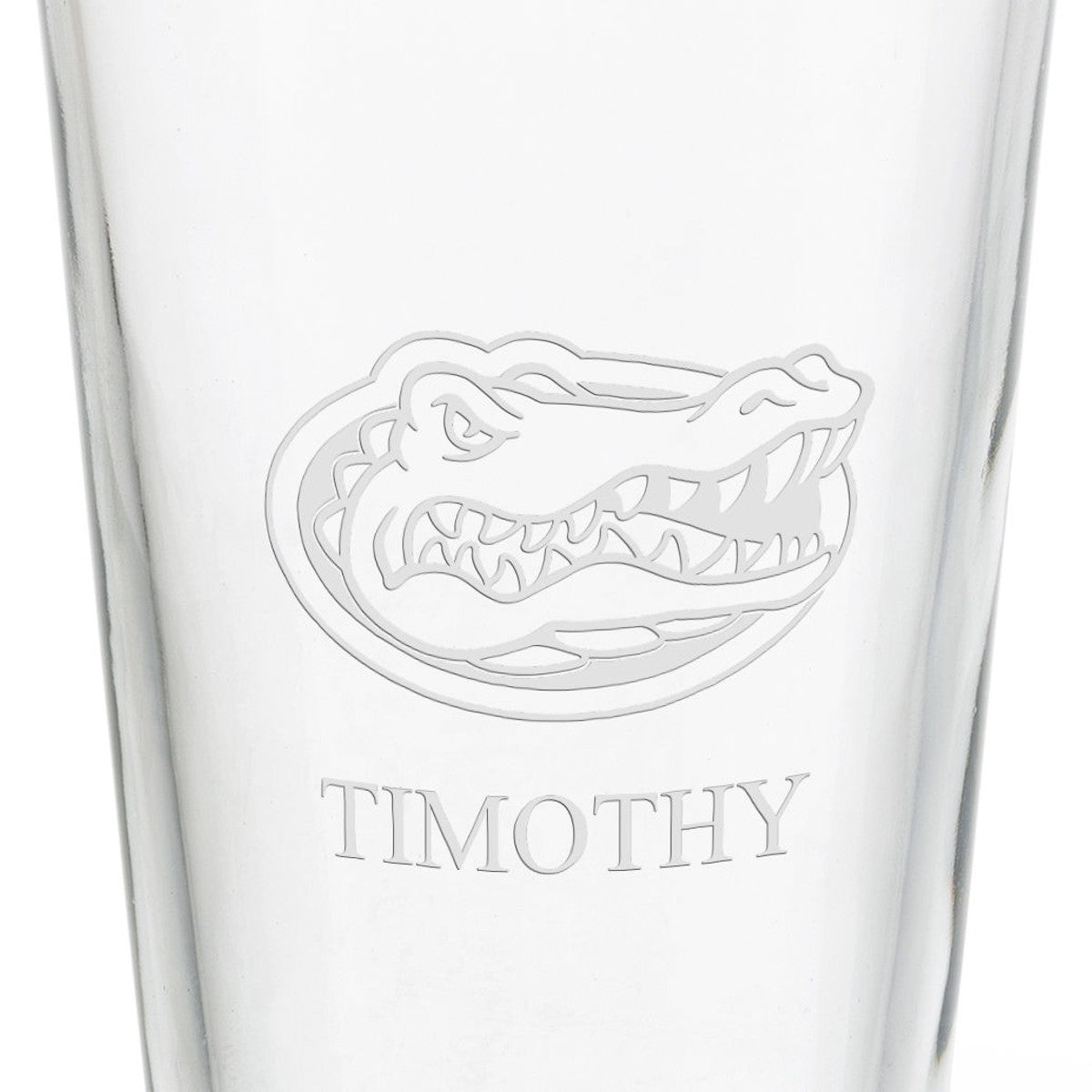 Each Florida 16 oz pint glass is deep-etched with the University of Florida logo. Its simple styling and crystal-clear clarity make this glass perfect for any drink. Your name can be added under the logo for free.