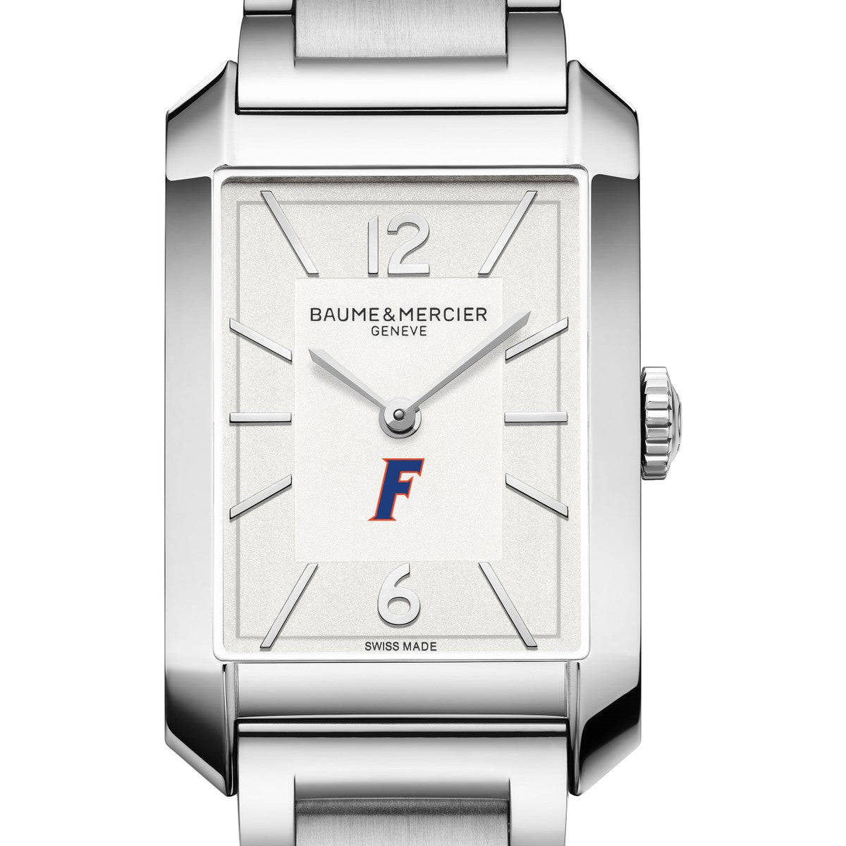 The Florida Men's Baume et Mercier Hampton Watch combines contemporary design with timeless elegance. Its silver opaline dial, featuring the Florida logo, rhodium-plated hands, and stainless steel bracelet make this rectangular timepiece a refined choice for any stylish man. Complimentary personal engraving.