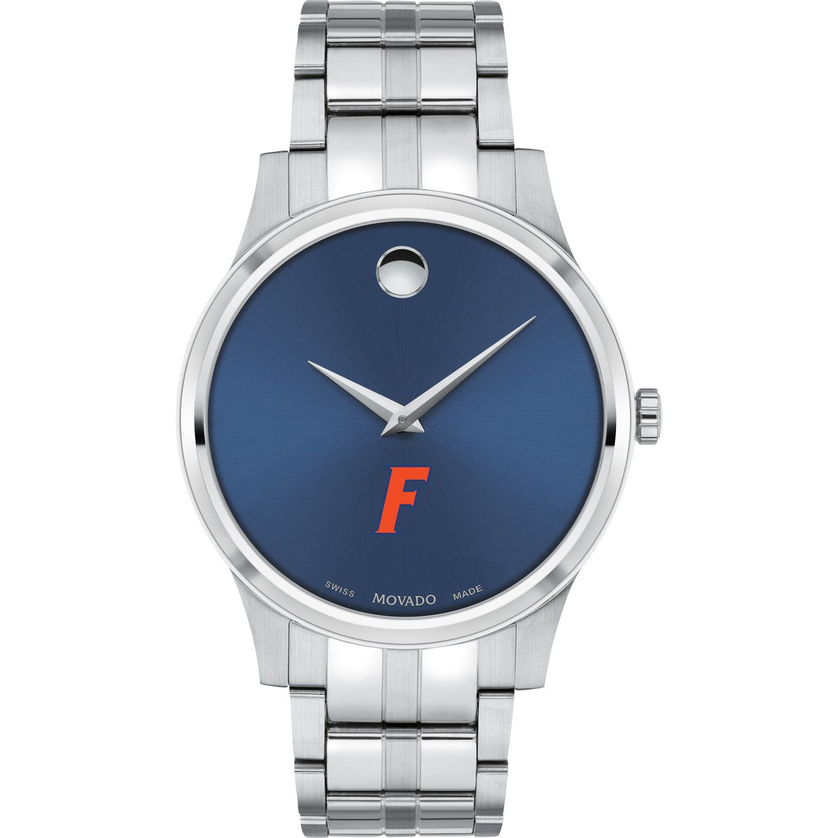 The University of Florida Men's Movado Collection watch boasts a striking blue dial featuring the iconic Florida Logo in full color. This timeless timepiece, renowned for its concave dot representing the sun at high noon, has been a symbol of elegance since its inception in 1947. Make it uniquely yours with free engraving without affecting order processing time.