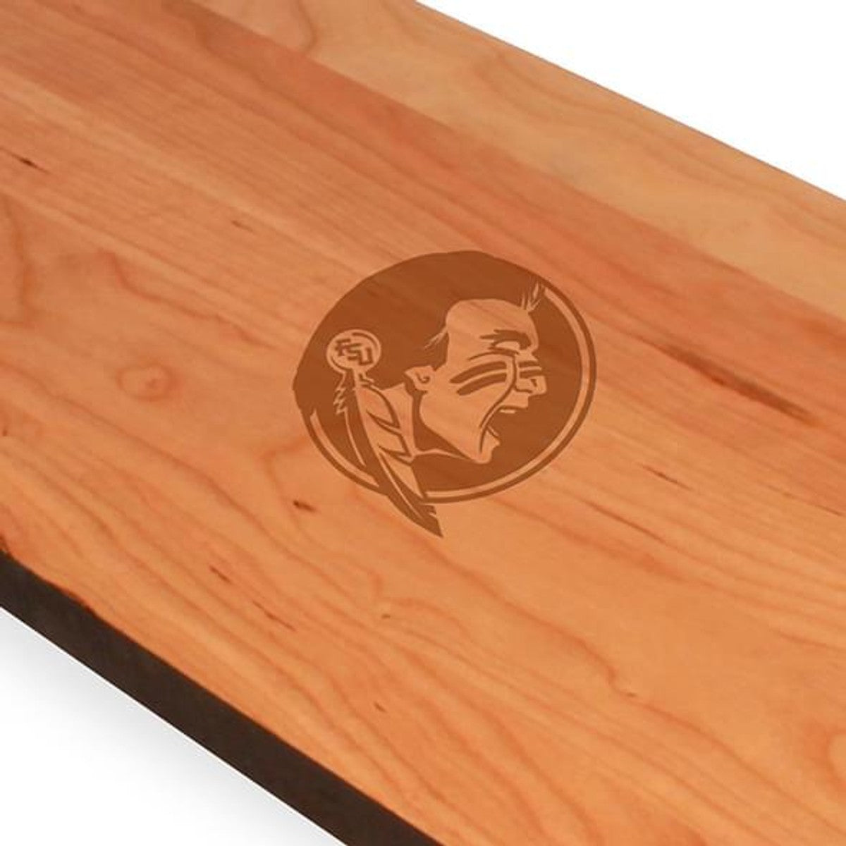 The Florida State University Cherry Entertaining Board features the FSU Logo beautifully engraved in the center. The sleek, elongated shape with black burnished edges makes a wonderful focal point on the table, and the oval handles permit easy transport from the kitchen.