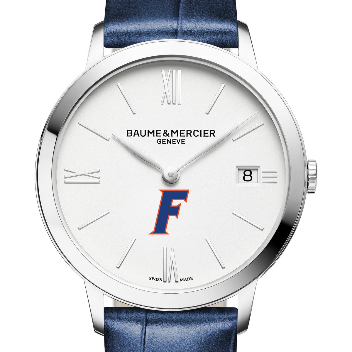 Add a touch of luxury with the Florida Women's Baume et Mercier 36.5mm Classima Watch. Its luminous white dial with Roman numerals, the Florida logo, and vibrant blue leather strap create a chic and refined look, perfect for any occasion. Complimentary personal engraving.