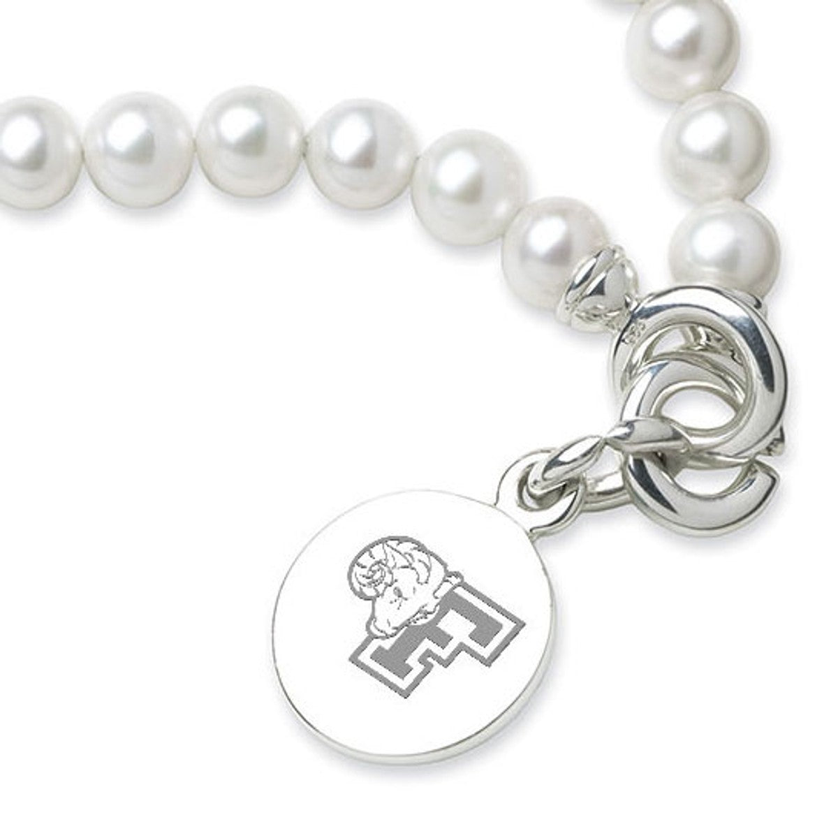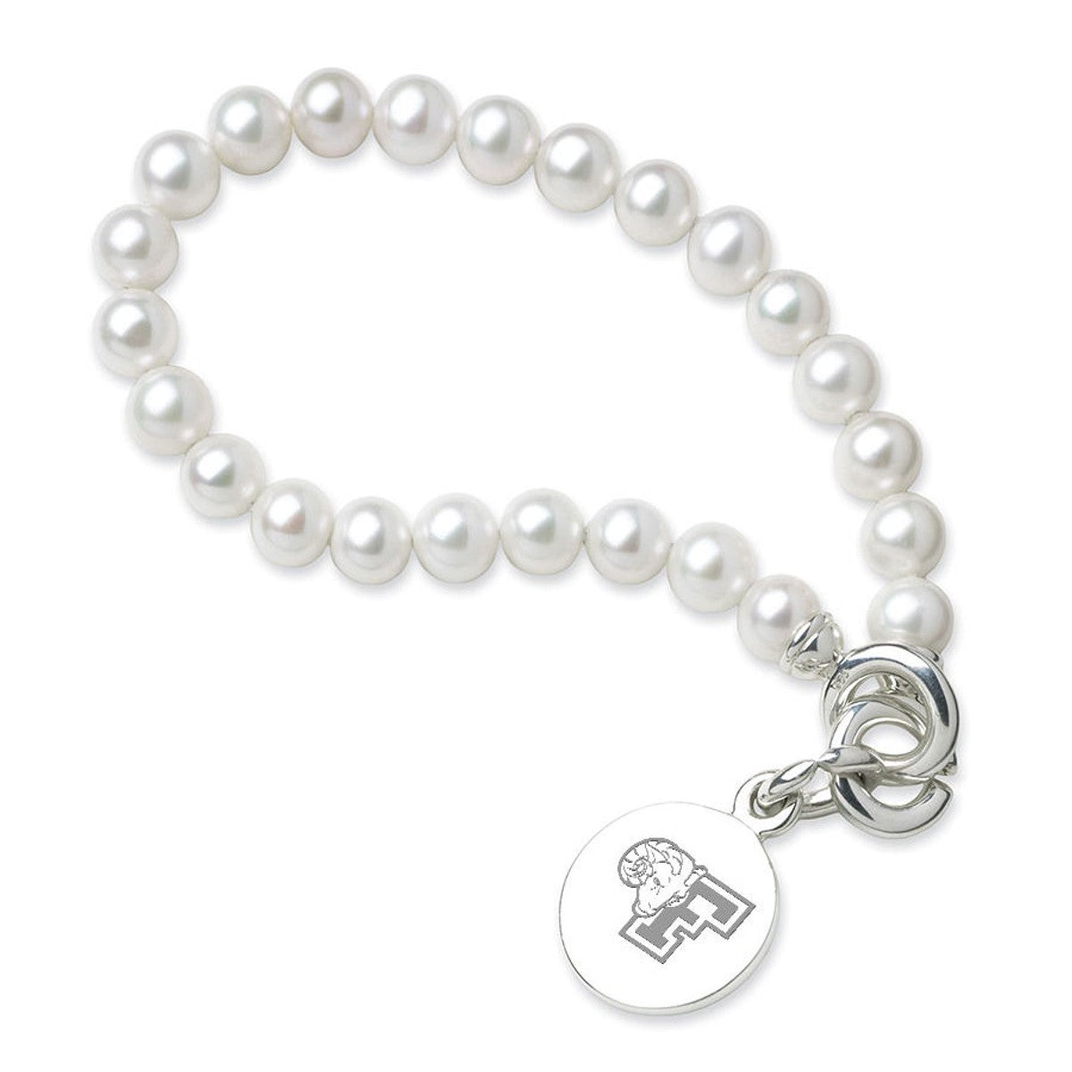 Fordham University pearl bracelet and sterling silver Fordham charm features the Fordham Logo delicately engraved on front and interlocking "C" clasp.