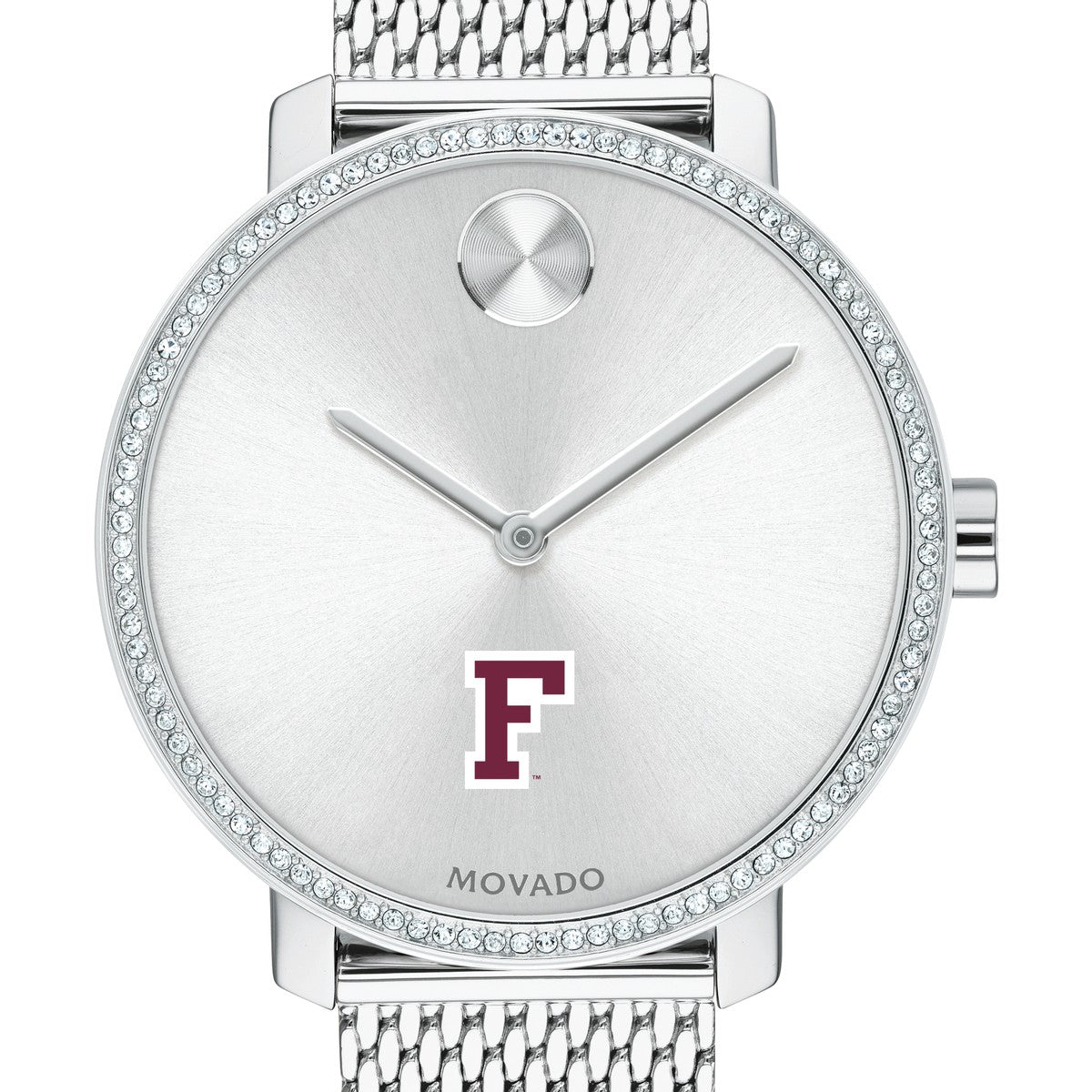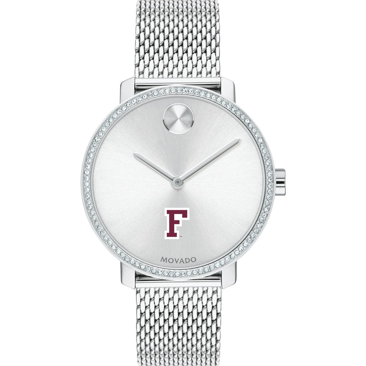 Fordham University Women's Movado BOLD watch features the Fordham Logo in full color at 6 o'clock on silver sunray dial.