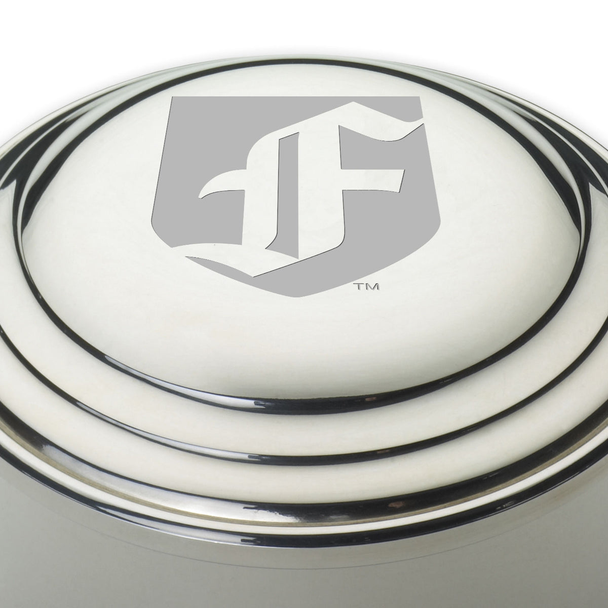 The lid of the Fordham University pewter keepsake box features the Fordham Logo.